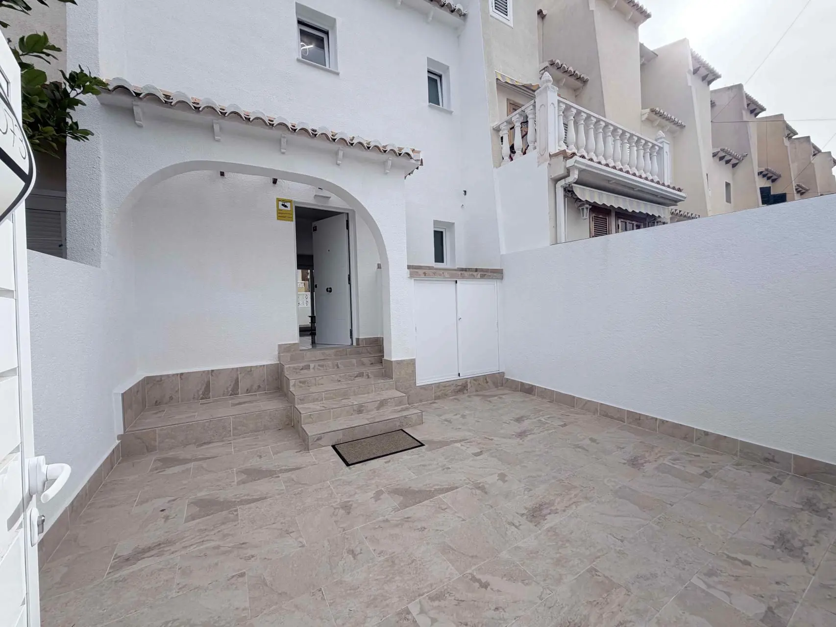 Discover this fully renovated, move-in ready townhouse, designed for those who value comfort, style, and an excellent quality of family life. The property features three spacious bedrooms and two bathrooms, offering the perfect space for each member of the household to enjoy their own private retreat. Imagine waking up each morning to natural light on your private balcony, or sharing unforgettable moments on its two terraces, ideal for barbecues, al fresco dining, or simply relaxing in the sun. Recently renovated, this townhouse allows you to move in worry-free and enjoy it from day one. It also boasts two air conditioning units that guarantee year-round comfort. The property offers access from two streets, is distributed over three floors, and includes a solarium with panoramic views of the sea and the Torrevieja lagoons—a perfect spot to unwind and enjoy the scenery. The private residential complex features a communal swimming pool, ideal for cooling off and enjoying time with friends or family during the warmer months. Unbeatable Location Just a few minutes’ walk from the Filton Shopping Centre (Los Balcones), with bars, restaurants, a pharmacy, beauty salons, a veterinarian, and much more! The Torrevieja University Hospital and several schools are less than 3 minutes away by car, while the beaches of Punta Prima and La Zenia are less than 10 minutes away. Alicante International Airport is only 40 minutes away by car, making this property a perfect option for both permanent residence and holiday homes. Expenses and Community Fees The community fees are approximately €144 per year, and the property tax (IBI) is around €220 per year, ensuring comfortable and affordable maintenance. Don’t miss this unique opportunity. Come and visit this magnificent townhouse and discover the home where you’ll start your new life.