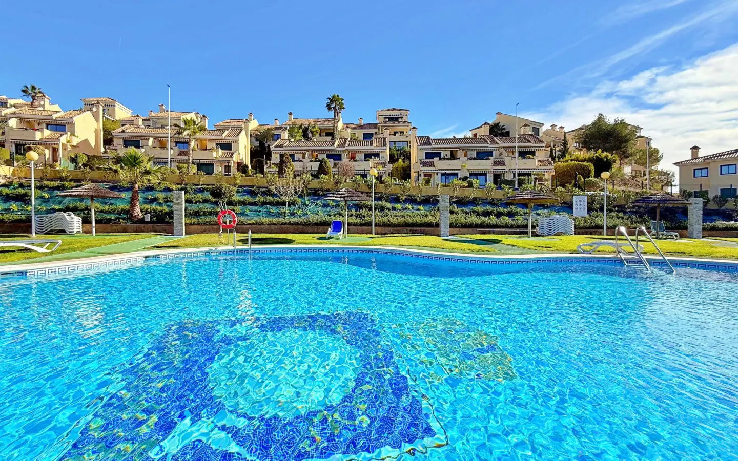 This townhouse in Lomas de Campoamor stands out for its southwest orientation and excellent use of outdoor spaces, designed to enjoy the afternoon sun and sunsets. With 83 m2 of living space, it offers a functional layout of 2 bedrooms and 2 bathrooms, is in good condition, and comes equipped with air conditioning. The property’s key value lies in its three outdoor areas: a 25 m2 garden plot at the entrance, a 15 m2 rear porch, and a 33 m2 rooftop solarium, offering unobstructed direct views of the golf course. The complex features green areas and a large communal swimming pool. Its location is strategic for golfers and holidaymakers alike: just 500 meters from the Real Club de Golf Campoamor and adjacent to commercial areas with supermarkets and restaurants, offering all amenities within walking distance without sacrificing the tranquility of the surroundings.