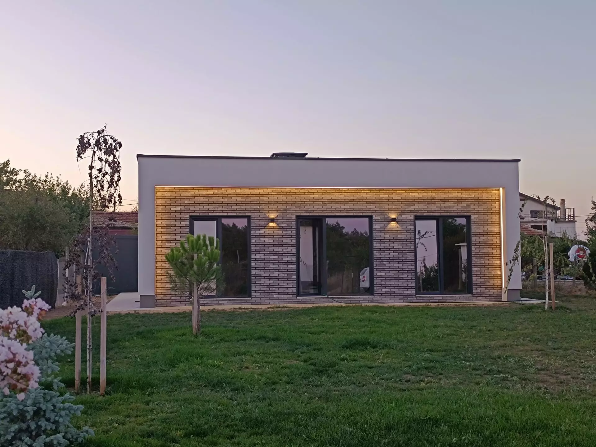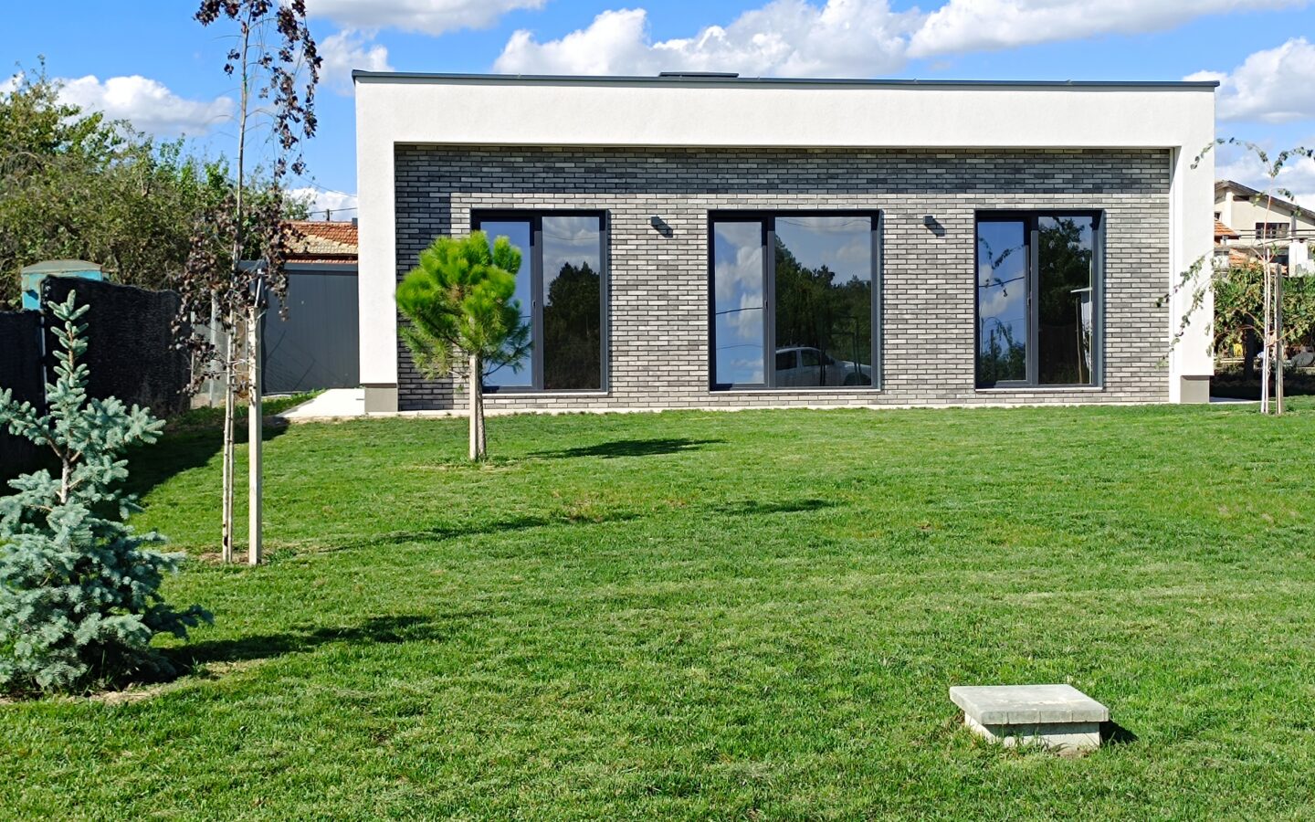 The layout of the home is designed for comfort and functionality. It includes a living room that benefits from floor-to-ceiling French windows, which would allow for ample natural light and a connection to the outdoors. There are three bedrooms in total, along with two bathrooms and a dedicated laundry room, which is a practical addition for modern living. A significant feature contributing to the sense of openness is the 3-meter ceiling height throughout the house. This higher ceiling is often associated with a feeling of spaciousness and can enhance the overall ambiance of the home. In terms of energy efficiency, the property is rated Energy Class A. This is achieved through the use of Rehau Artevo windows with triple glazing, a clinker brick facade for insulation and durability, and a Ceresit thermal insulation system. These elements collectively work to minimize heat loss and reduce energy consumption.