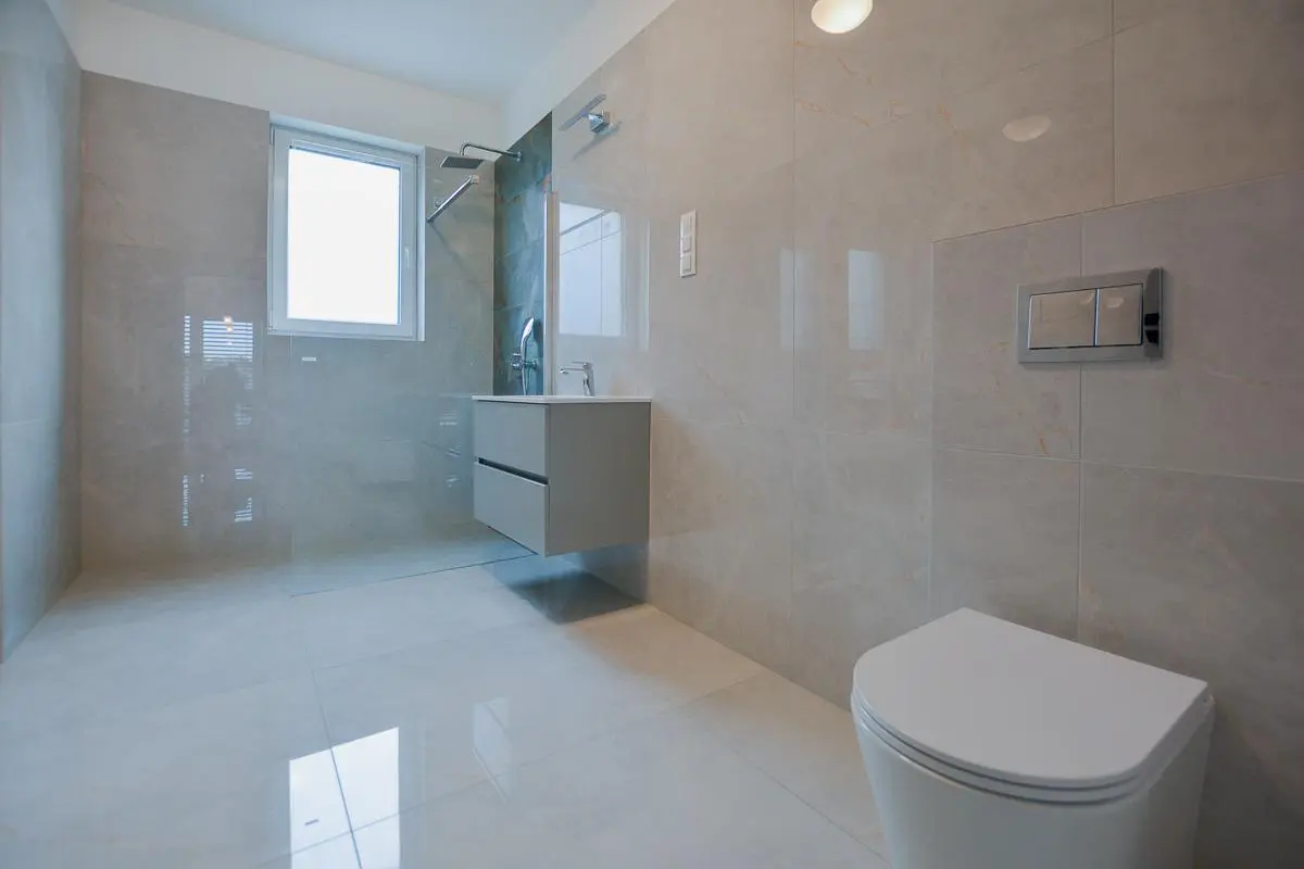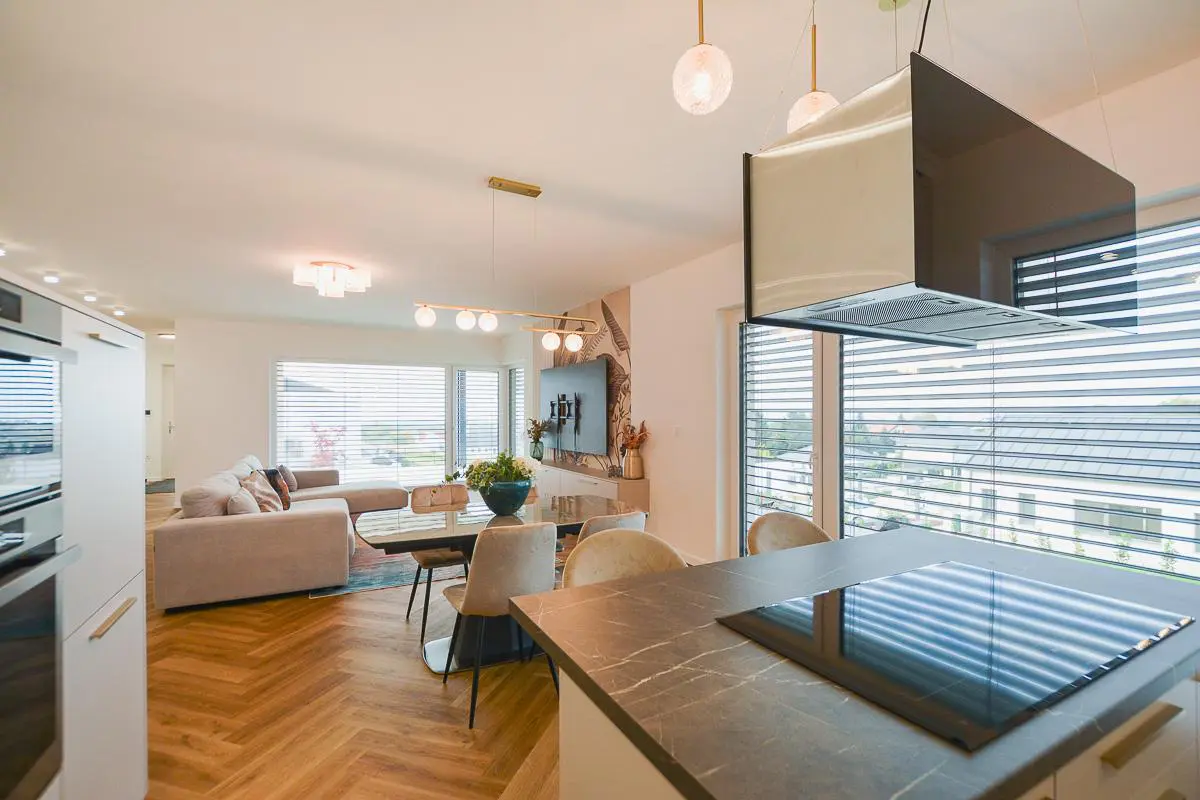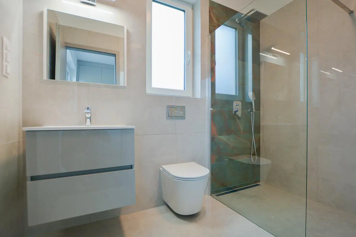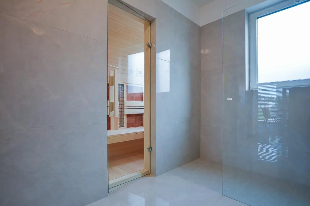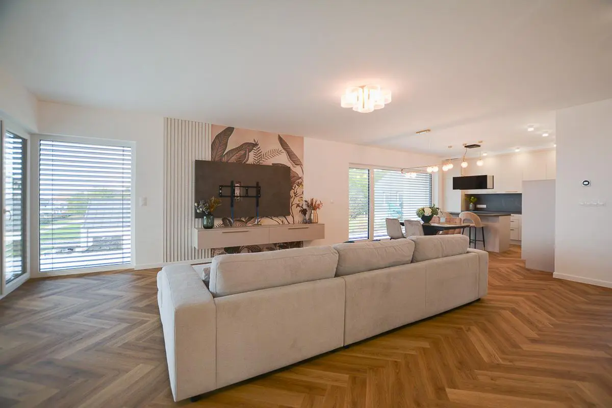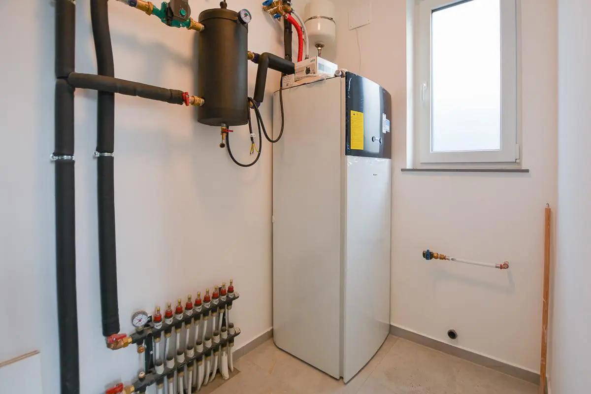 The house is finished to a high standard. So is it heated and cooled by a Daikin heat pump system that features underfloor heating and ceiling heating.