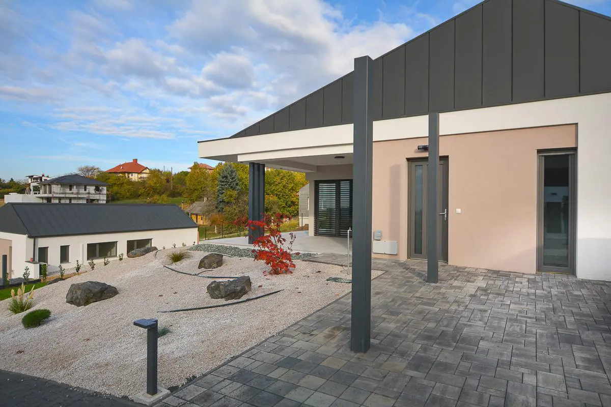 The 900 m² plot includes a landscaped garden with an automatic irrigation system. The plot also includes a double covered carport.