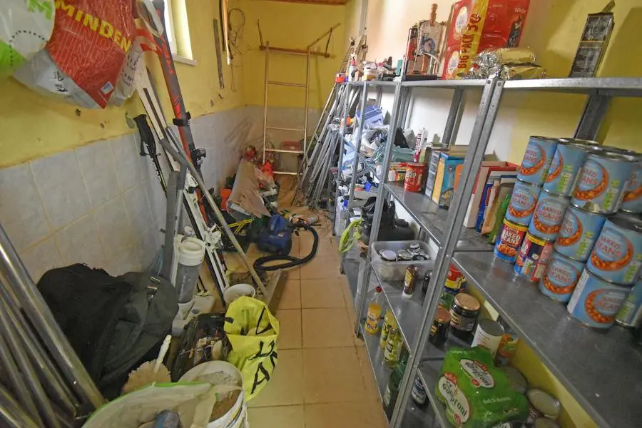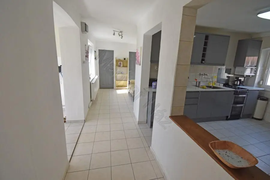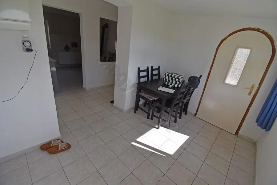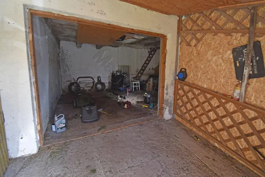 The 1961 m² plot includes a 30m² storage space directly adjacent to the house and a garage with storage space. The fenced plot boasts several trees, some grapevines, and a small vegetable garden.