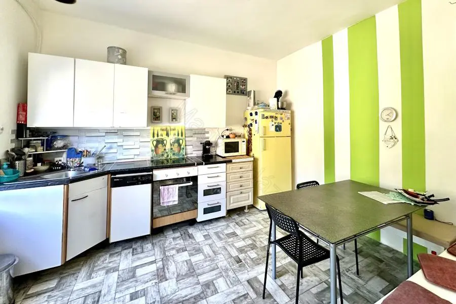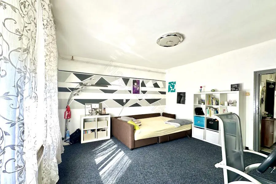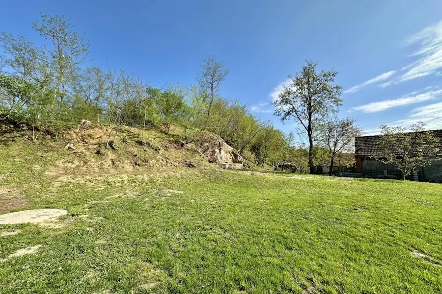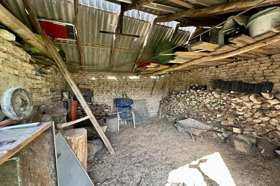 The plot is 1,068 m² and is completely fenced. The garden is well-maintained, featuring various fruit trees and shrubs, including apple, peach, walnut, raspberry, grape, and gooseberry. There are also several outbuildings on the site that are suitable as storage space or as a workshop. There is also a garage and a well.