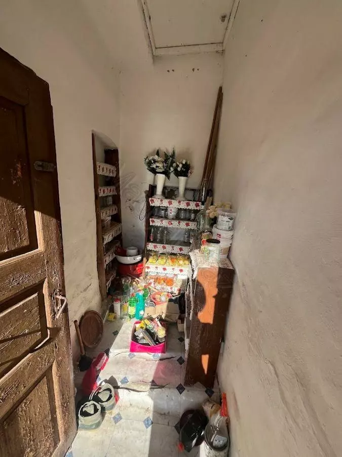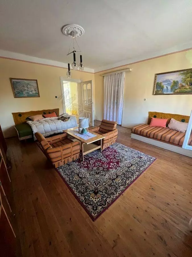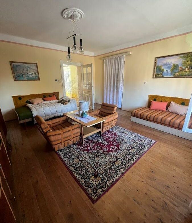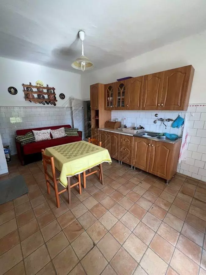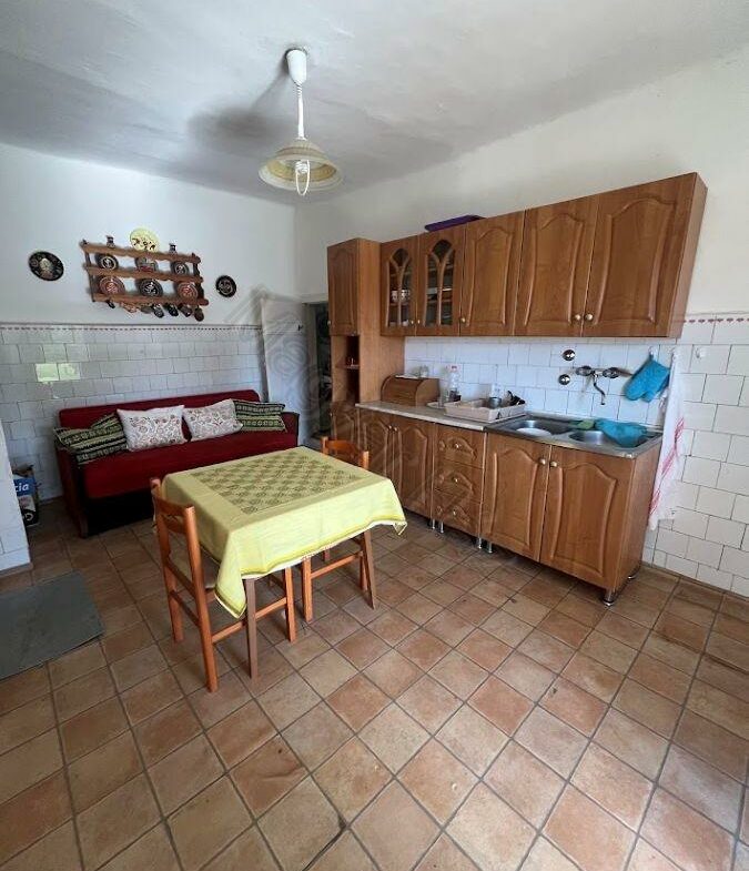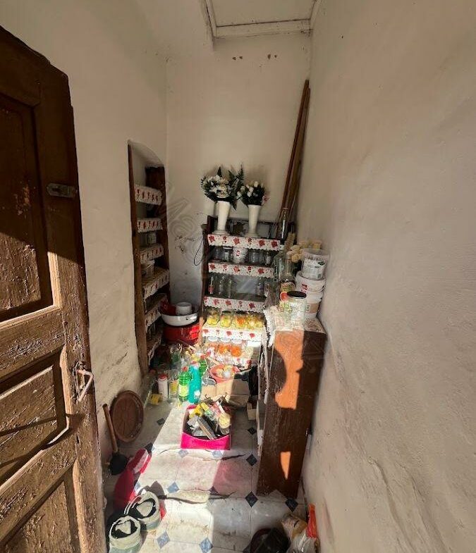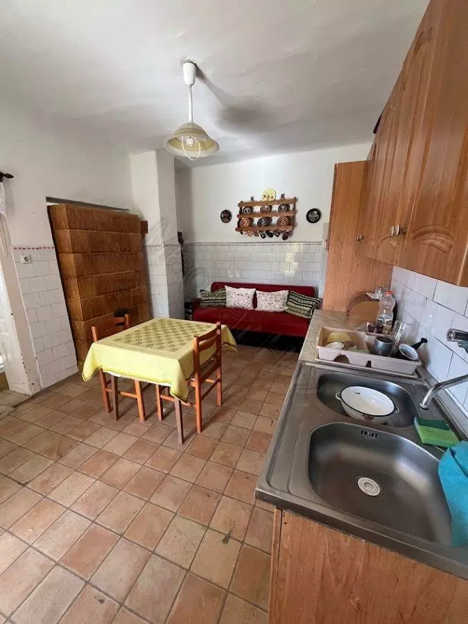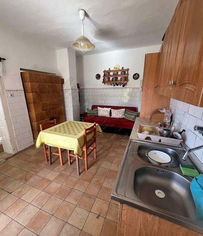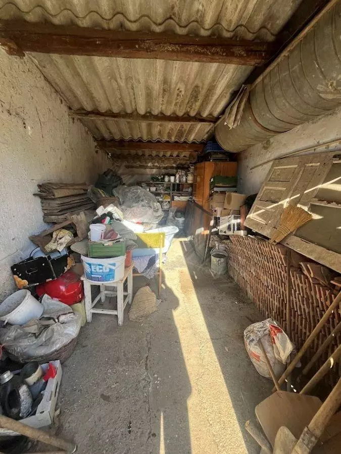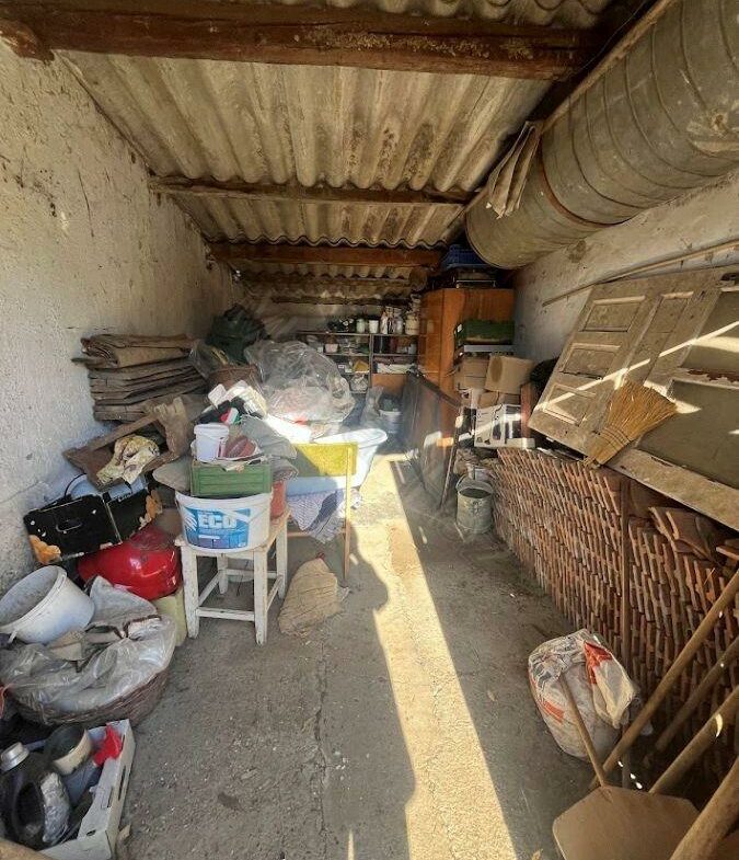 This property features a living room, two bedrooms, a kitchen, and a bathroom. Adjacent to the house, you’ll find a storage room, a garage, and several outbuildings that have historically been used for keeping animals.