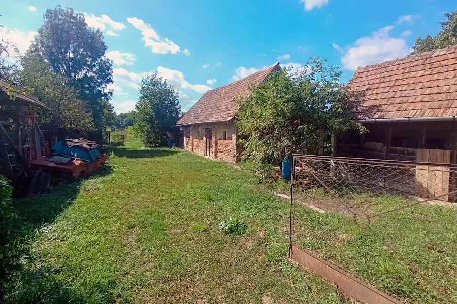 The property spans a 6,745 m² plot, which includes a garage, a cellar, a well, and the remnants of former stables. Numerous fruit trees are present, including walnut, cherry, pear, apple, plum, and various grapevines. A stream borders the edge of the plot, adding to the natural environment.