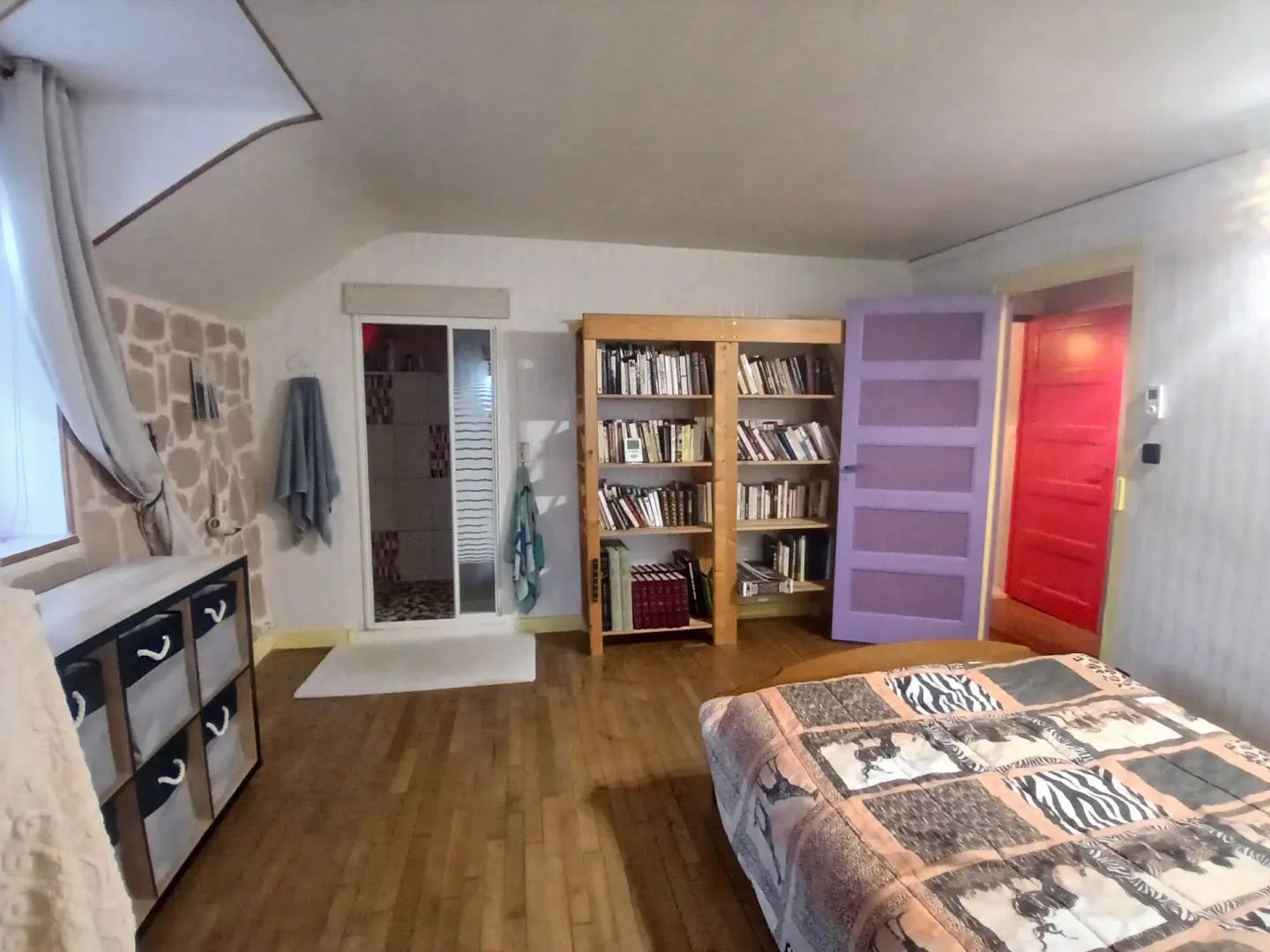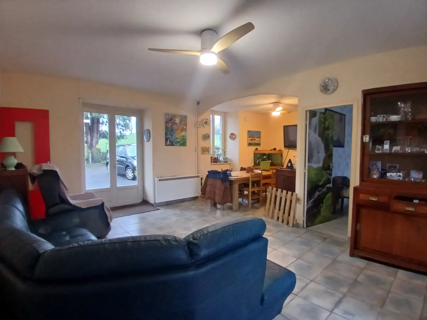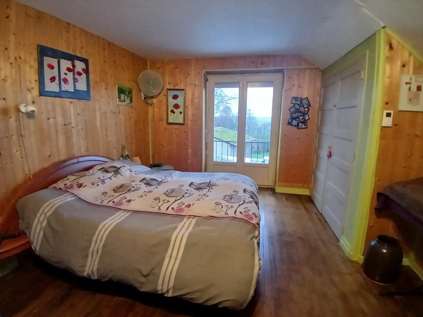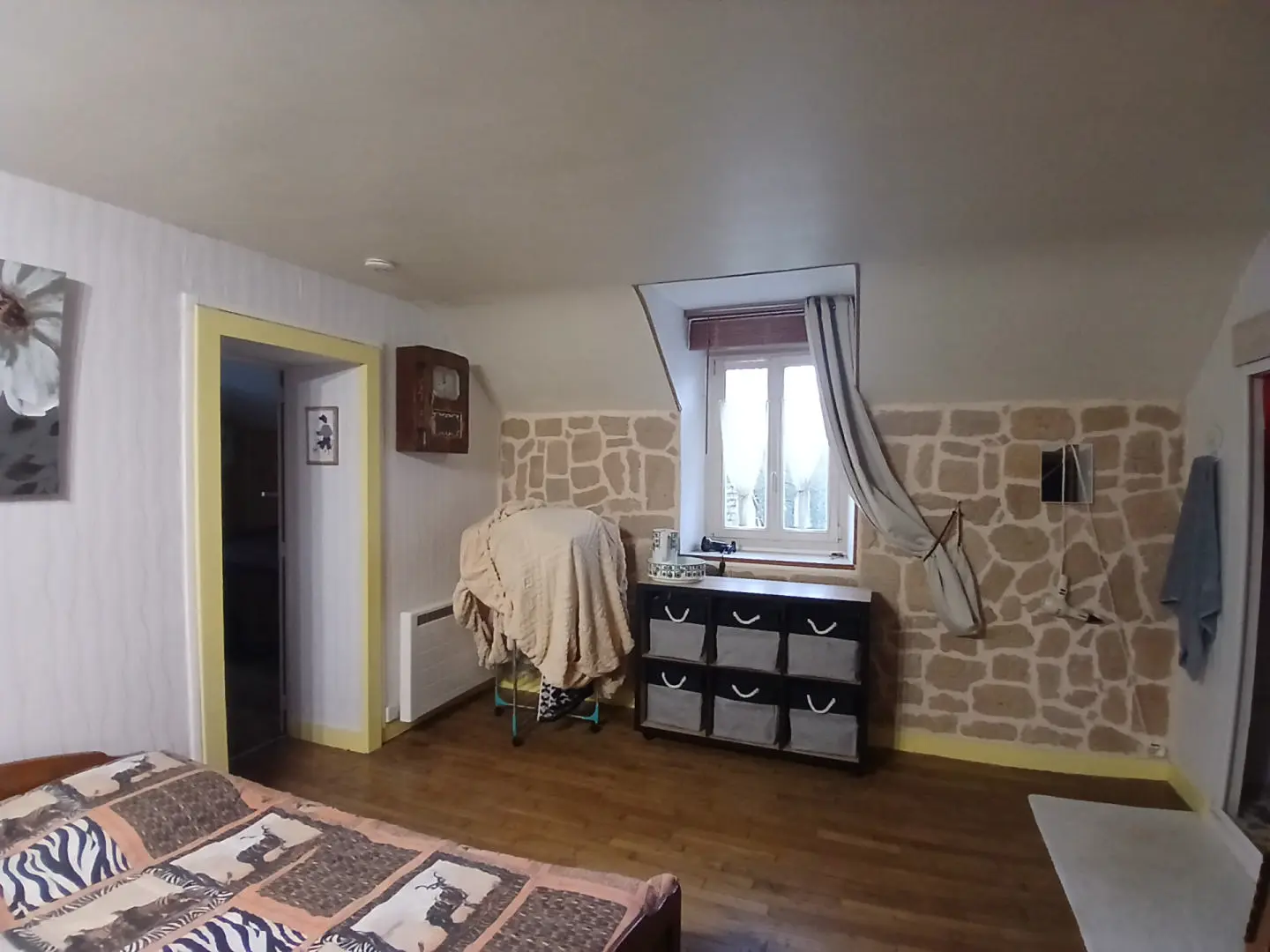 The house presents a regional architectural style with its stone exterior, an independent barn, and an entrance leading to a large courtyard driveway. It also features a mature garden with numerous fruit trees. The property has been updated with an efficient central heating system and double glazing. The ground floor comprises two bedrooms, a living room, a kitchen, and a bathroom. Upstairs, there are two additional bedrooms, an office, and a shower room. One of the upstairs bedrooms includes a small balcony that overlooks the garden. An attic space of 40 m² is available for potential conversion, subject to planning permission.