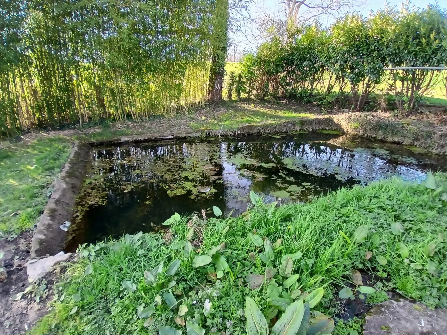 Across the courtyard, opposite the house, stands the barn/workshop, which measures 69m². Behind the barn, there is a well and a natural stone pond measuring 8 x 5 meters. The garden is rich with trees and a variety of fruits. The area offers a shaded spot suitable for warmer days. A lawned area with mature, colorful shrubs is also present.