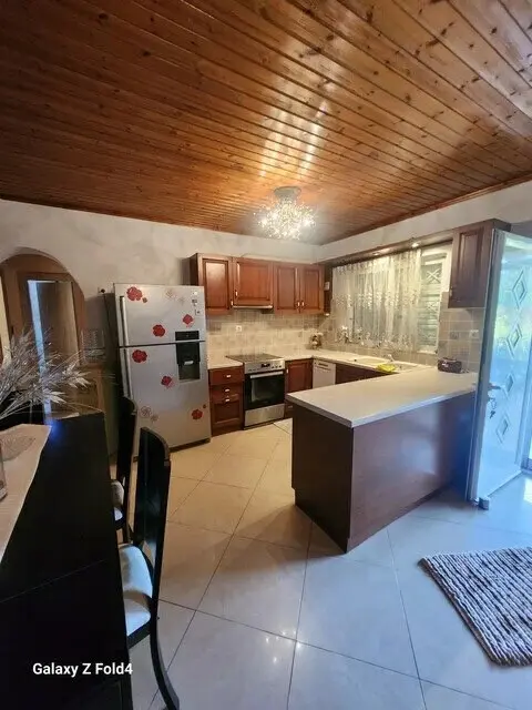 This is a two-story house located in Attica, with a total area of 140 square meters. The ground floor of the property includes two bedrooms, a living room combined with a kitchen, a separate kitchen, one shower room with a toilet, and a separate toilet.