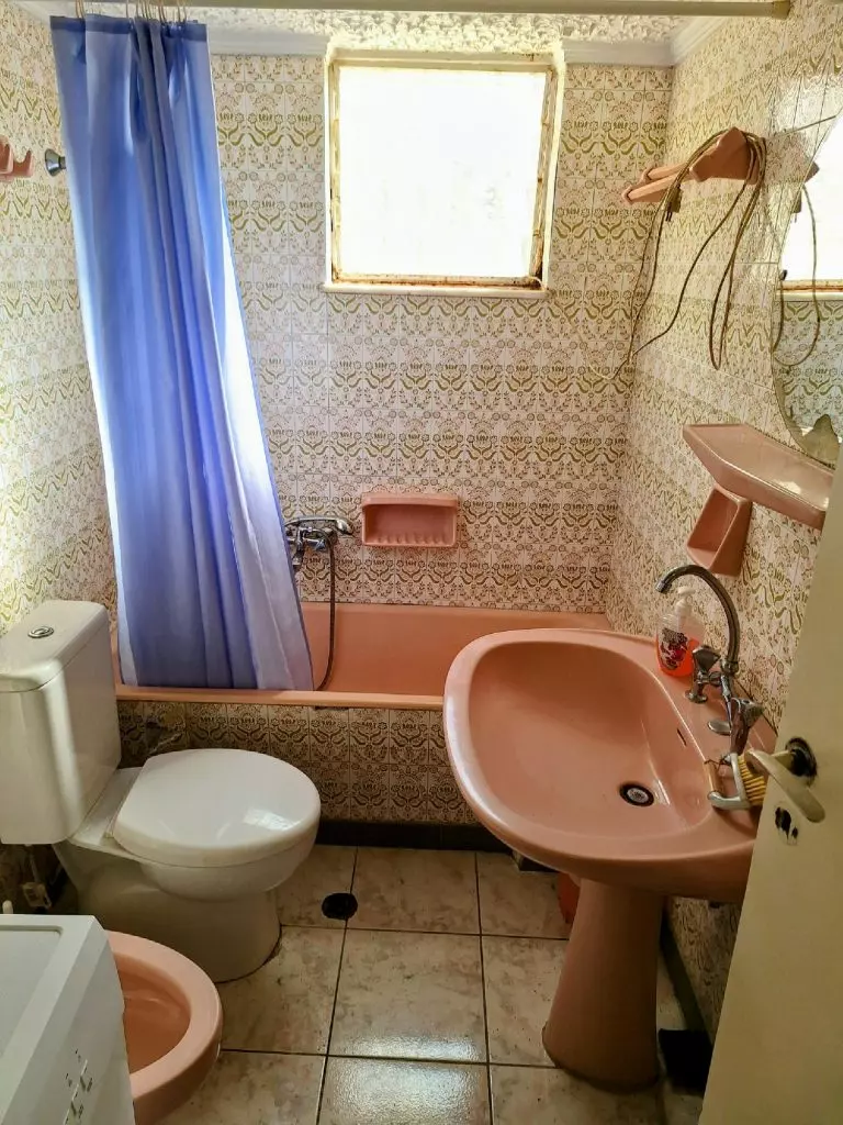 - Bathroom – Featuring a pink bathtub, sink, bidet, and washing machine.