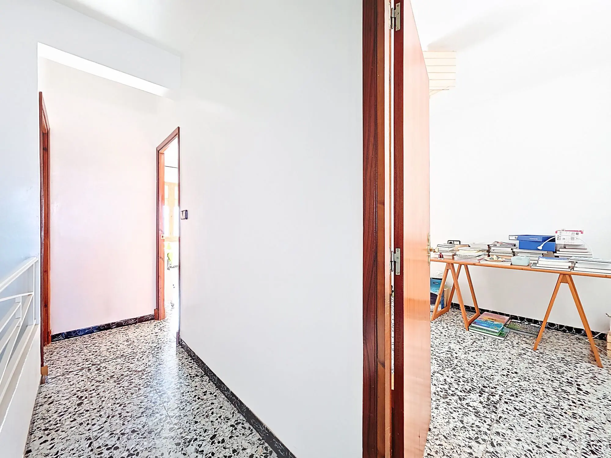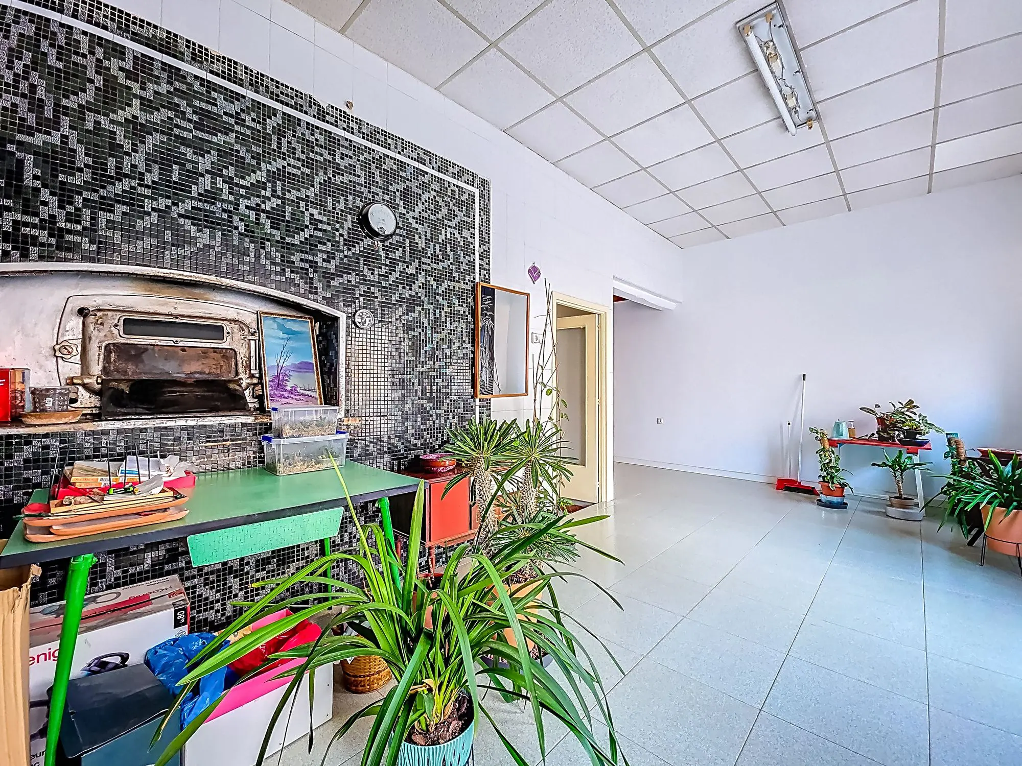 Entering through the main entrance leads to a hallway. This area was formerly a bakery, and some original features remain visible. From the hallway, there is access to the lower floor and to the upper floor via a rear section. This rear section contains a large room that can be configured as desired. At the back of this room is an indoor terrace.
