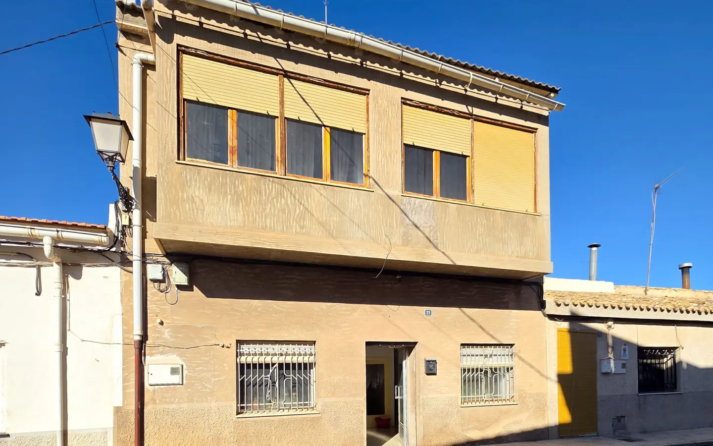 This three-storey village house is located in Pinoso. The home has a main entrance on one street and a second entrance to the patio on another street, providing access on two different levels. The property comprises three floors, with the top floor featuring a roof terrace.