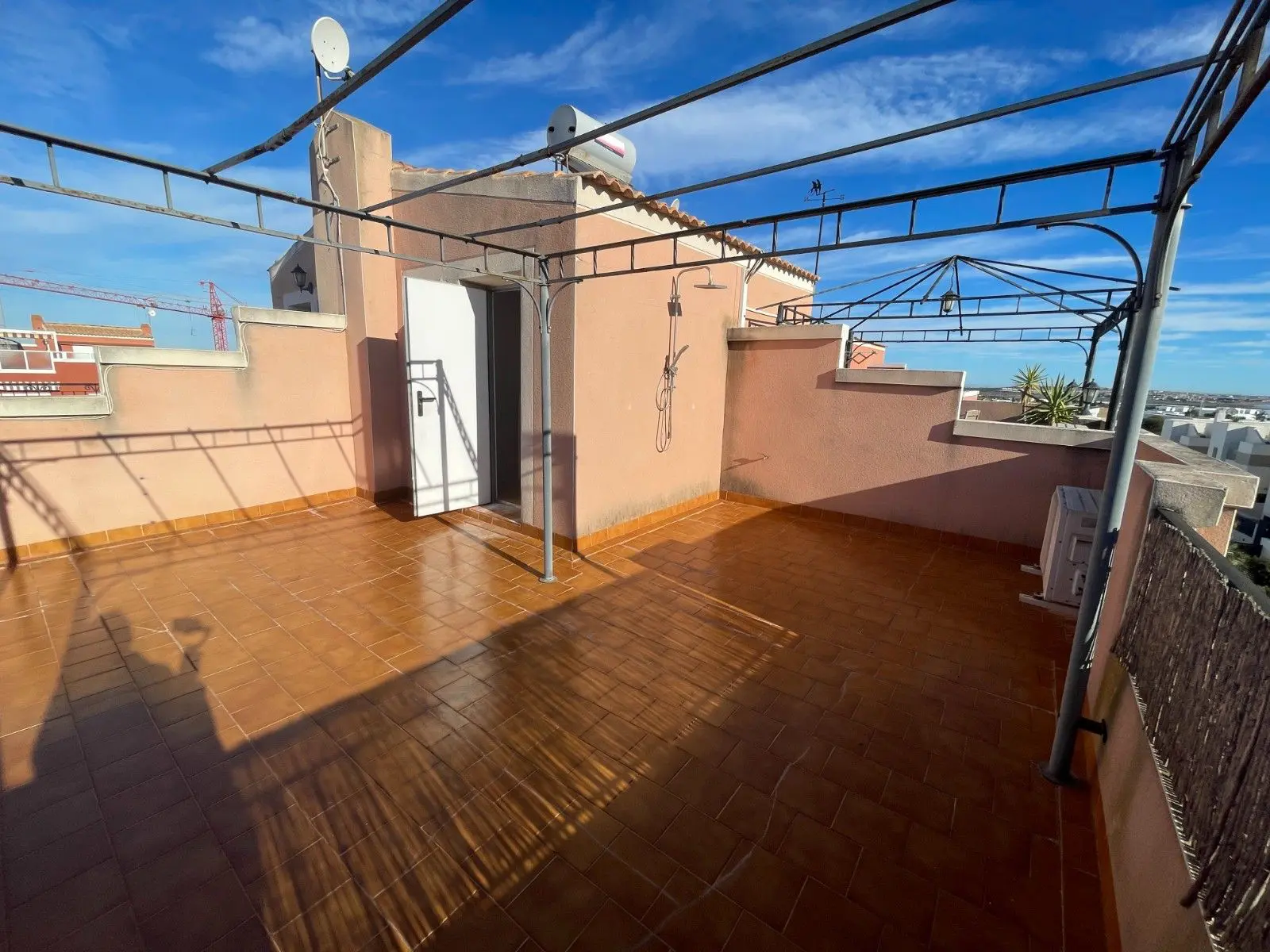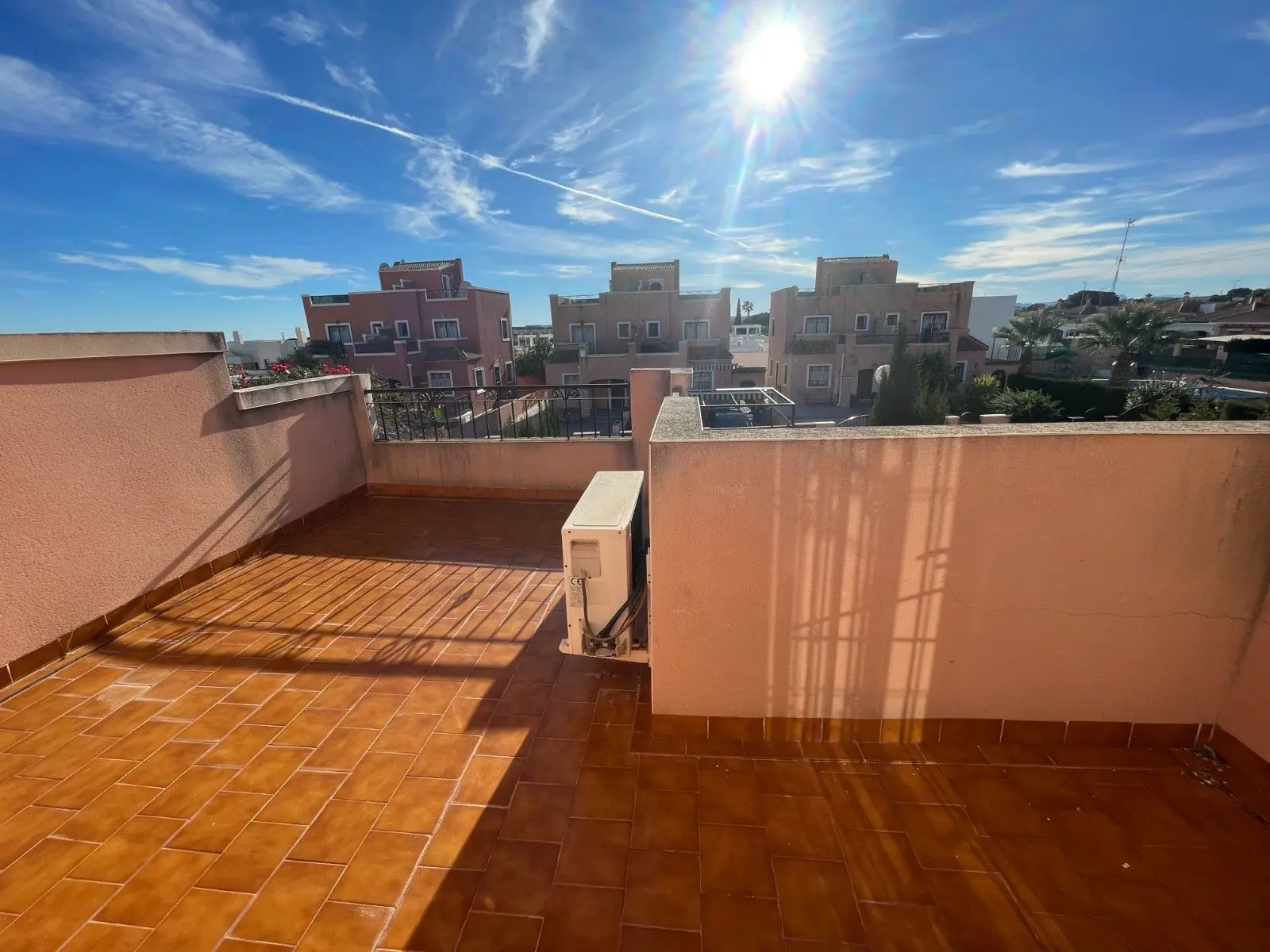 We invite you to discover this quad-style townhouse, located in the well-maintained and exclusive La Herrada residential area, next to the peaceful town of Los Montesinos. The property offers 83 m2 distributed over two floors plus a private solarium, designed to enjoy comfort and outdoor living. On the main floor, you will find a bright living-dining room with an open-plan kitchen, a full bathroom with shower, and direct access to the porch, which connects to the pleasant front garden, perfect for relaxing or enjoying the sun. An internal staircase leads to the second floor, where there are three spacious bedrooms, two with built-in wardrobes. The master bedroom also has access to a private terrace with lovely open views. On the top floor, the highlight is the large solarium, ideal for outdoor gatherings, dining with friends, or simply relaxing while enjoying the open views over the urbanisation and surrounding landscape. The property is part of a quiet and well-kept residential complex with a beautiful communal swimming pool, perfect for enjoying the Mediterranean climate all year round. Excellent access to the AP-7 motorway and close to Los Montesinos, San Miguel de Salinas, Torrevieja and La Mata, with all services and supermarkets just minutes away. An ideal home for those seeking peace, comfort and quality of life. Contact us and come and visit it – you will love it.