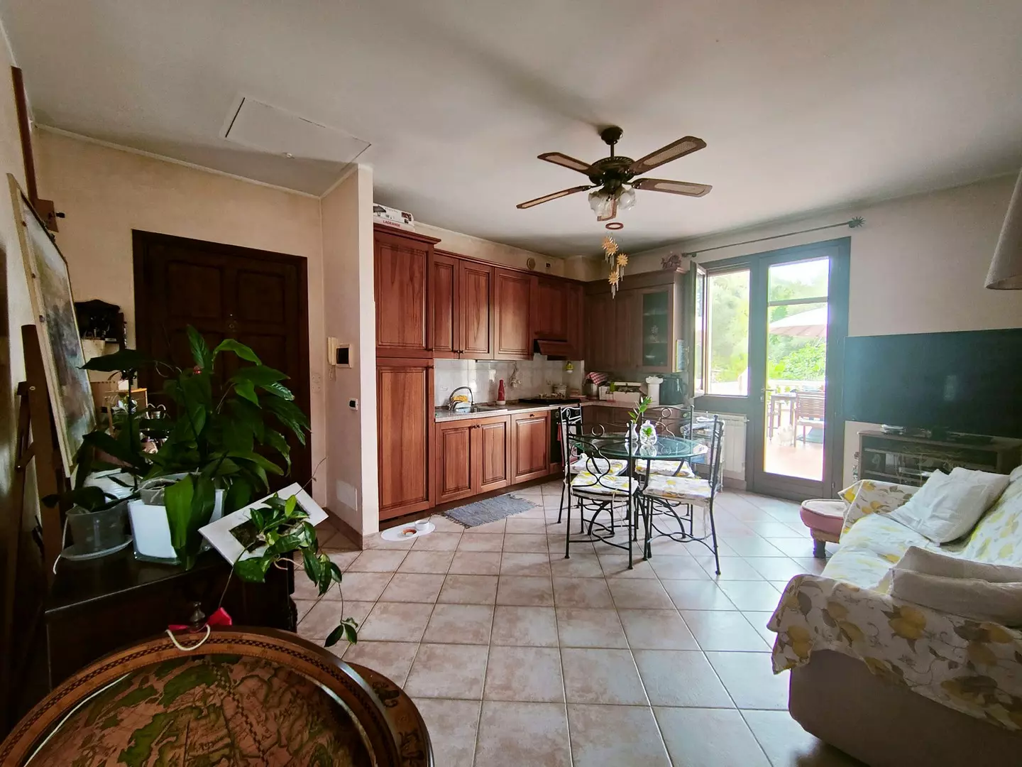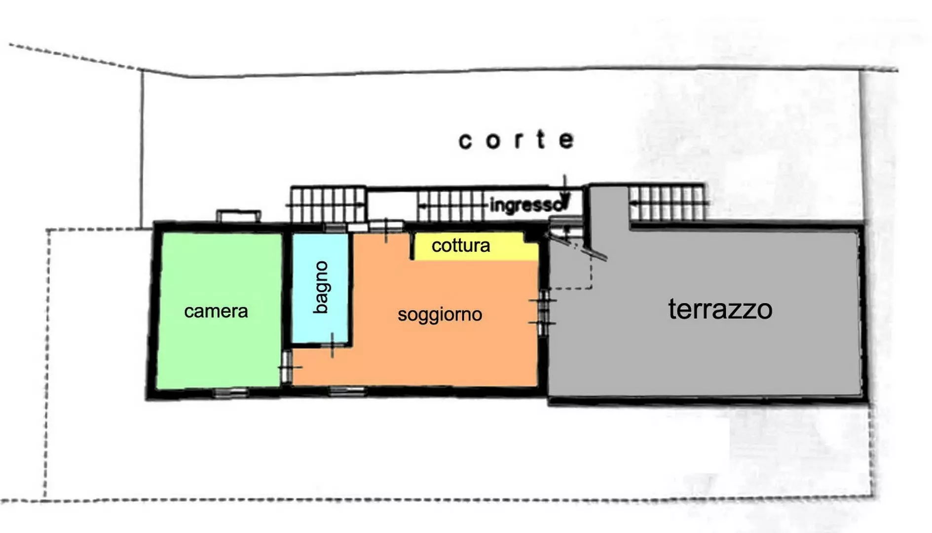 Al piano terra, con una superficie abitativa di 65 mq, troviamo un soggiorno con angolo cottura, una luminosa camera da letto e un bagno. Questo livello è caratterizzato da un grande terrazzo panoramico di 40 mq, perfetto per godere del clima mite di Soldano, e da un giardino di 800 mq.
