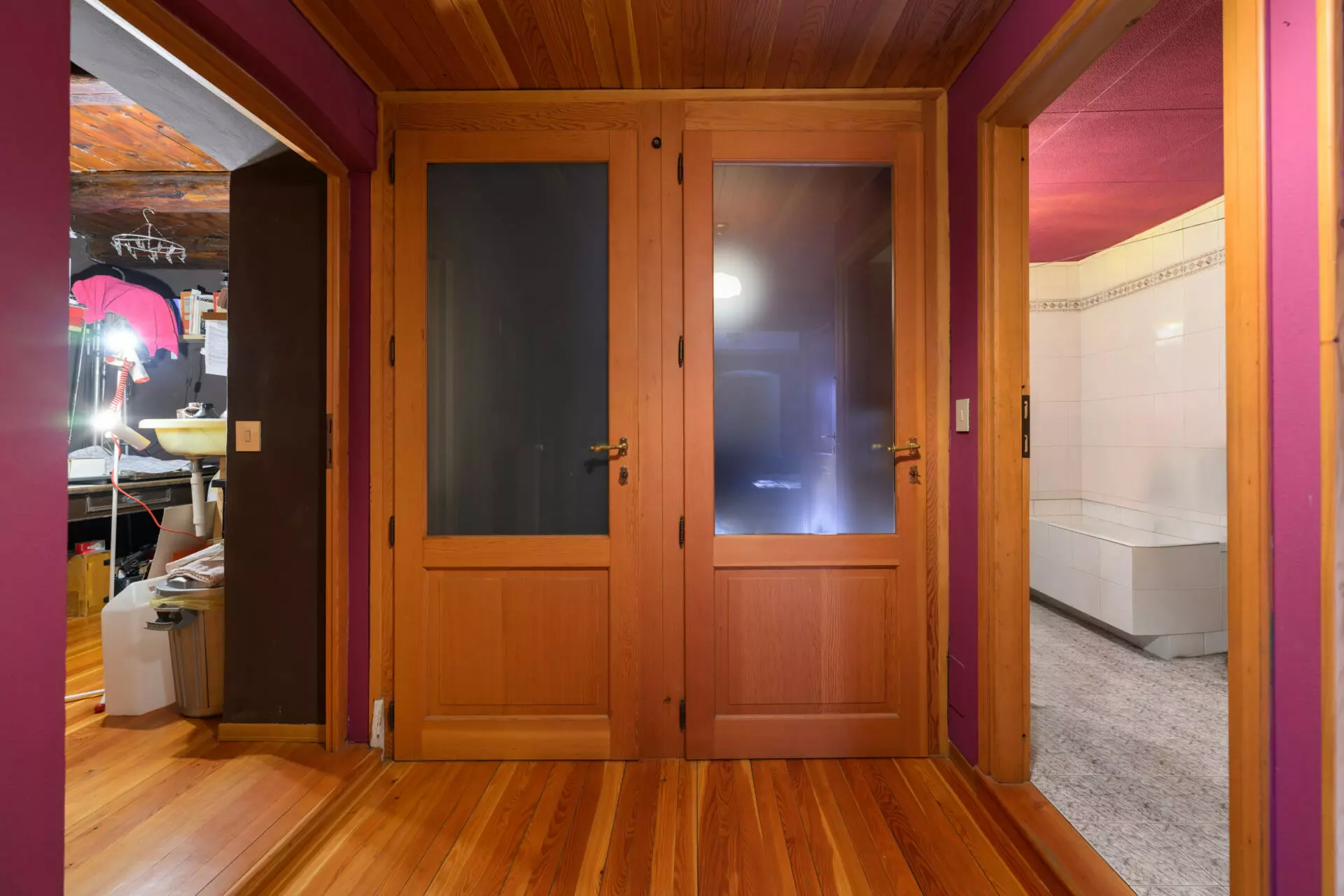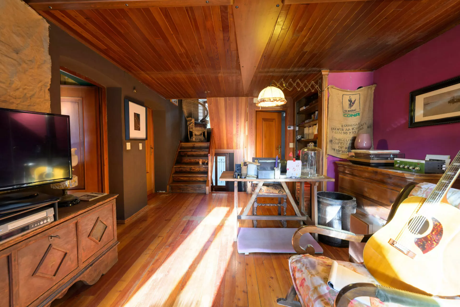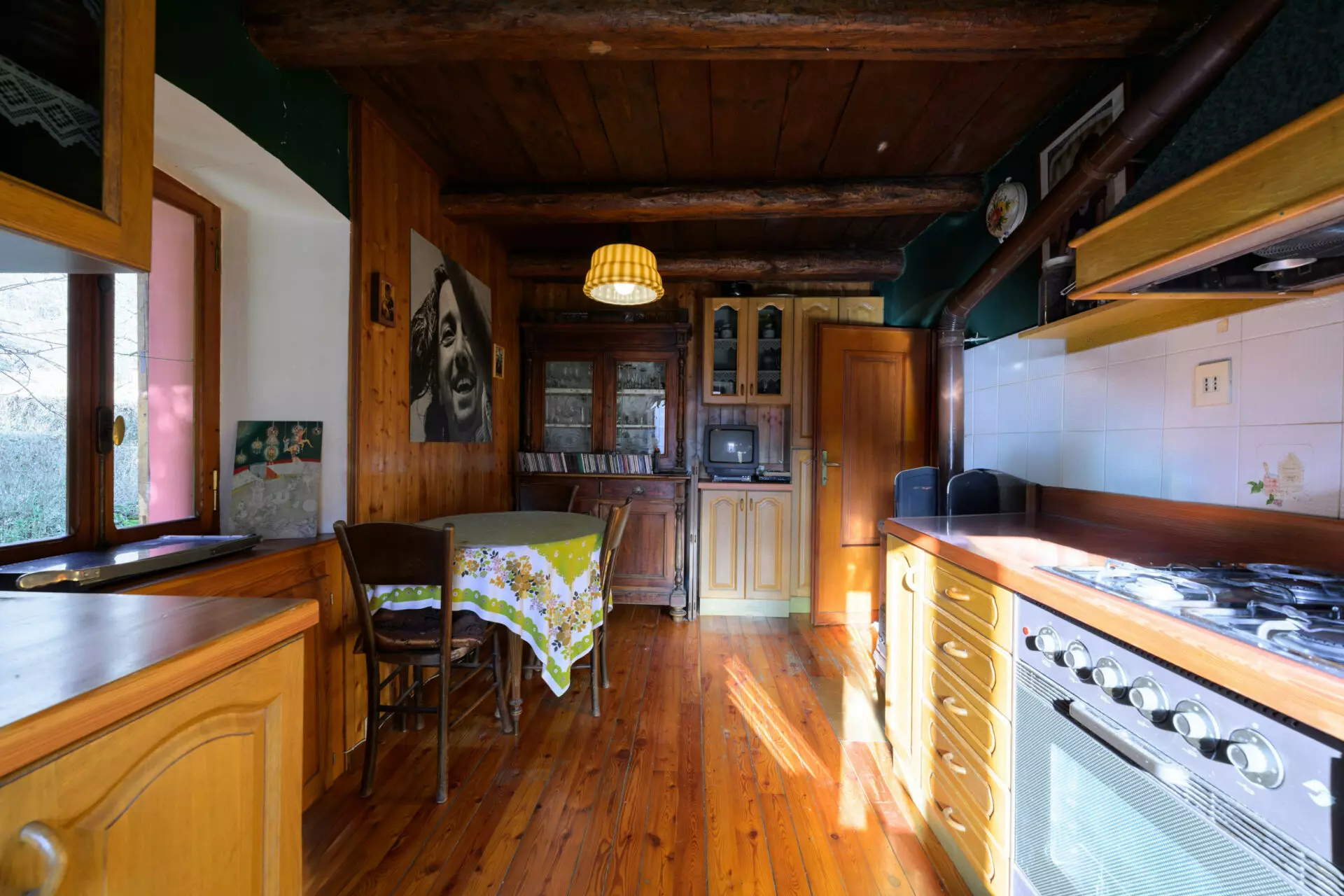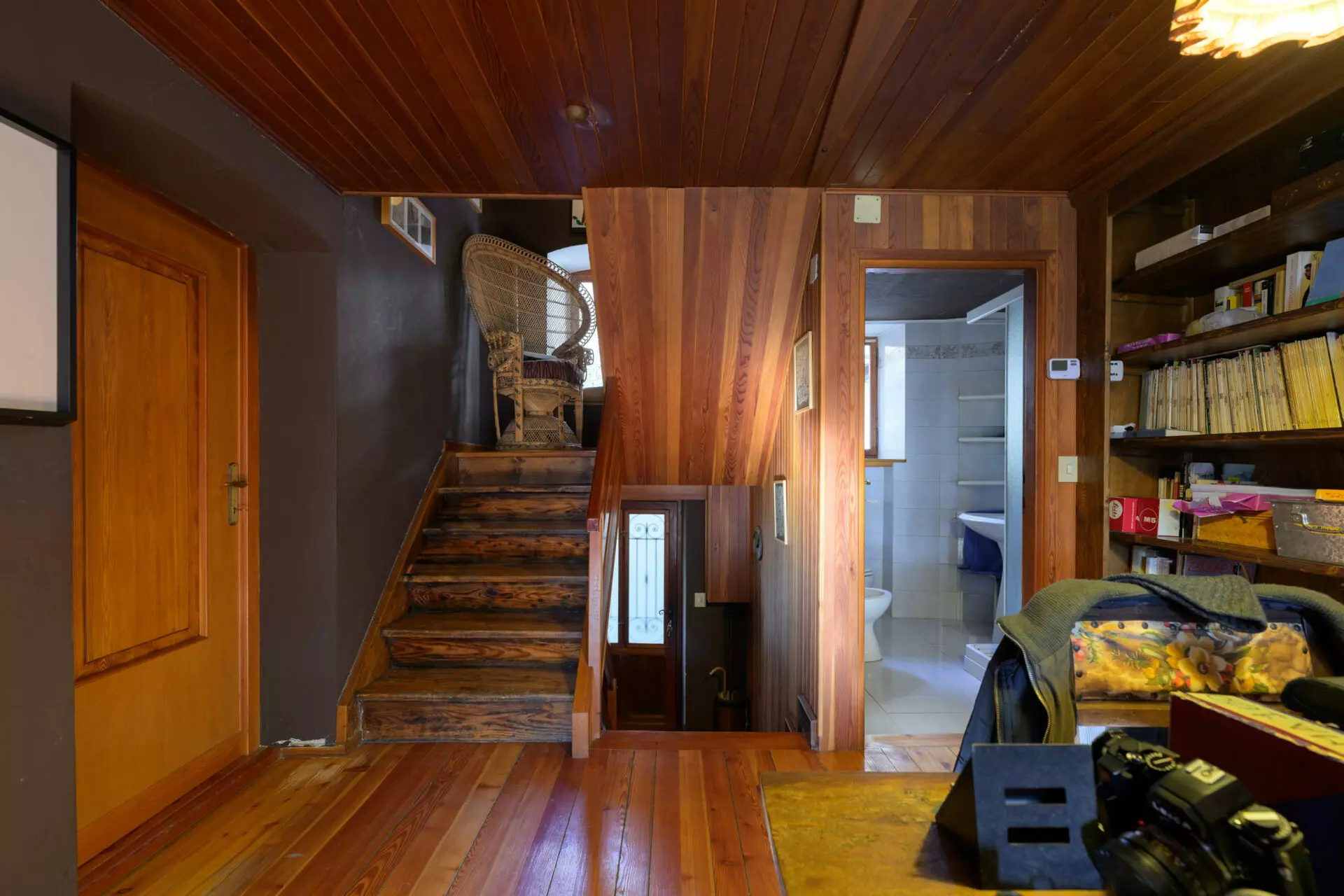 The entrance is located on the raised floor, where you step directly into the main living area. This space features wood elements that contribute to a naturally illuminated environment, thanks to two south-facing windows. The separate kitchen offers a practical design with dual exposure, while this level also includes a bedroom and a bathroom.