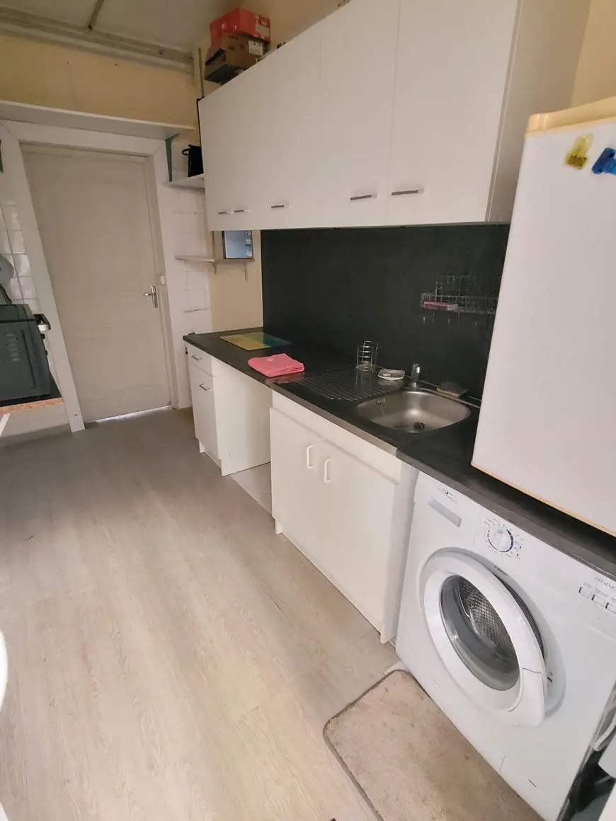 Ground = Entrance hall of approximately 20 m2 + room of 17.24 m2 with washbasin/storage and large window with protective grille + separate WC with washbasin of 1.83 m2 + equipped summer kitchen (apartment B) of 7 m2 (wall and base units, sink, refrigerator, mini-oven, washing machine) with access to a lovely private courtyard of 13 m2 + fitted kitchen (duplex A) of 11.5 m2 (wall and base units, electric oven, refrigerator, hob, dishwasher) with access to a courtyard of 8.5 m2.