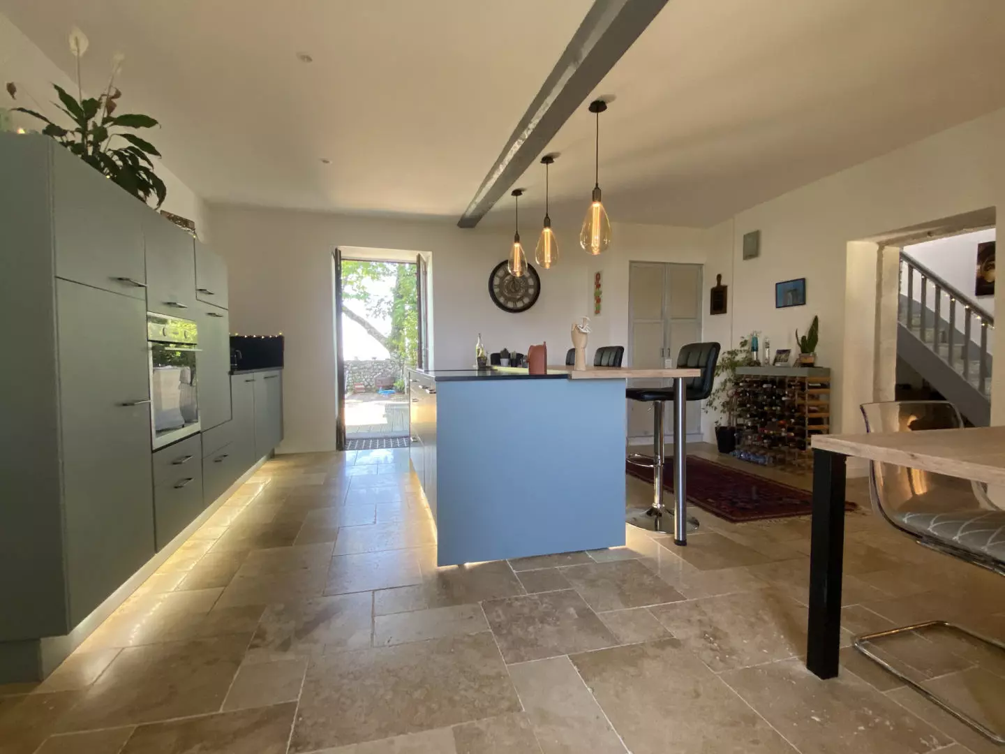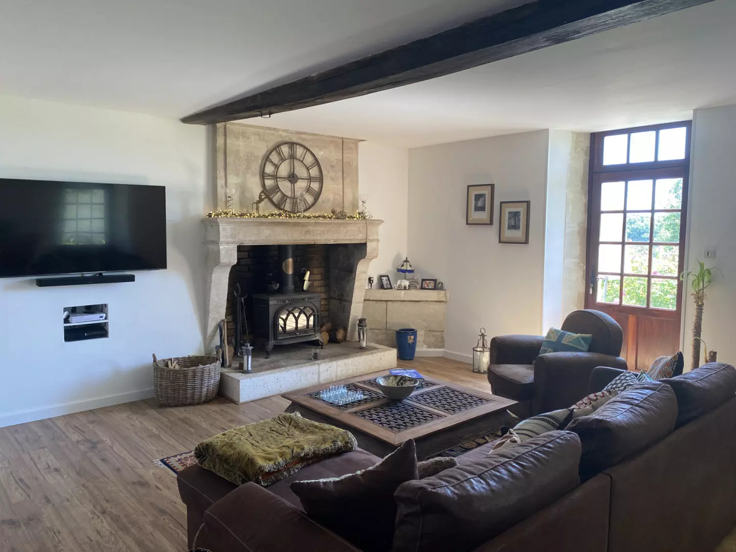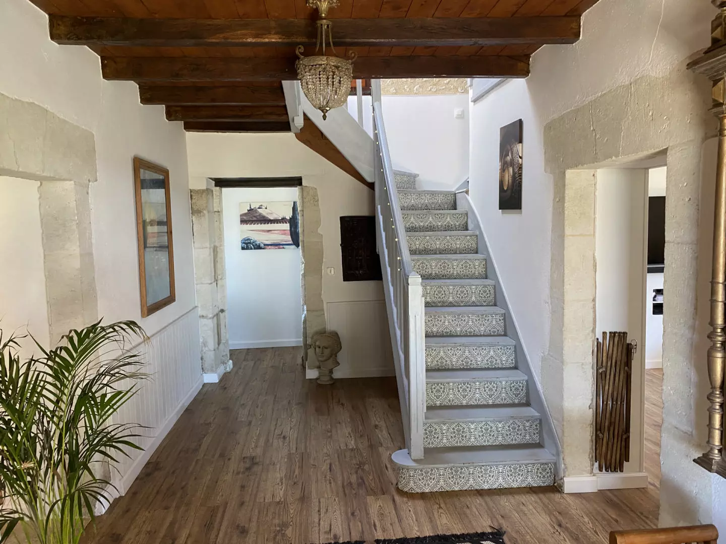 This property combines historical features with practical living spaces. On the ground floor, you will find a newly installed kitchen that opens into a large living room, which includes a Charentaise fireplace and a wood-burning stove. This setup is not only functional but also adds a pleasant ambiance to the home.