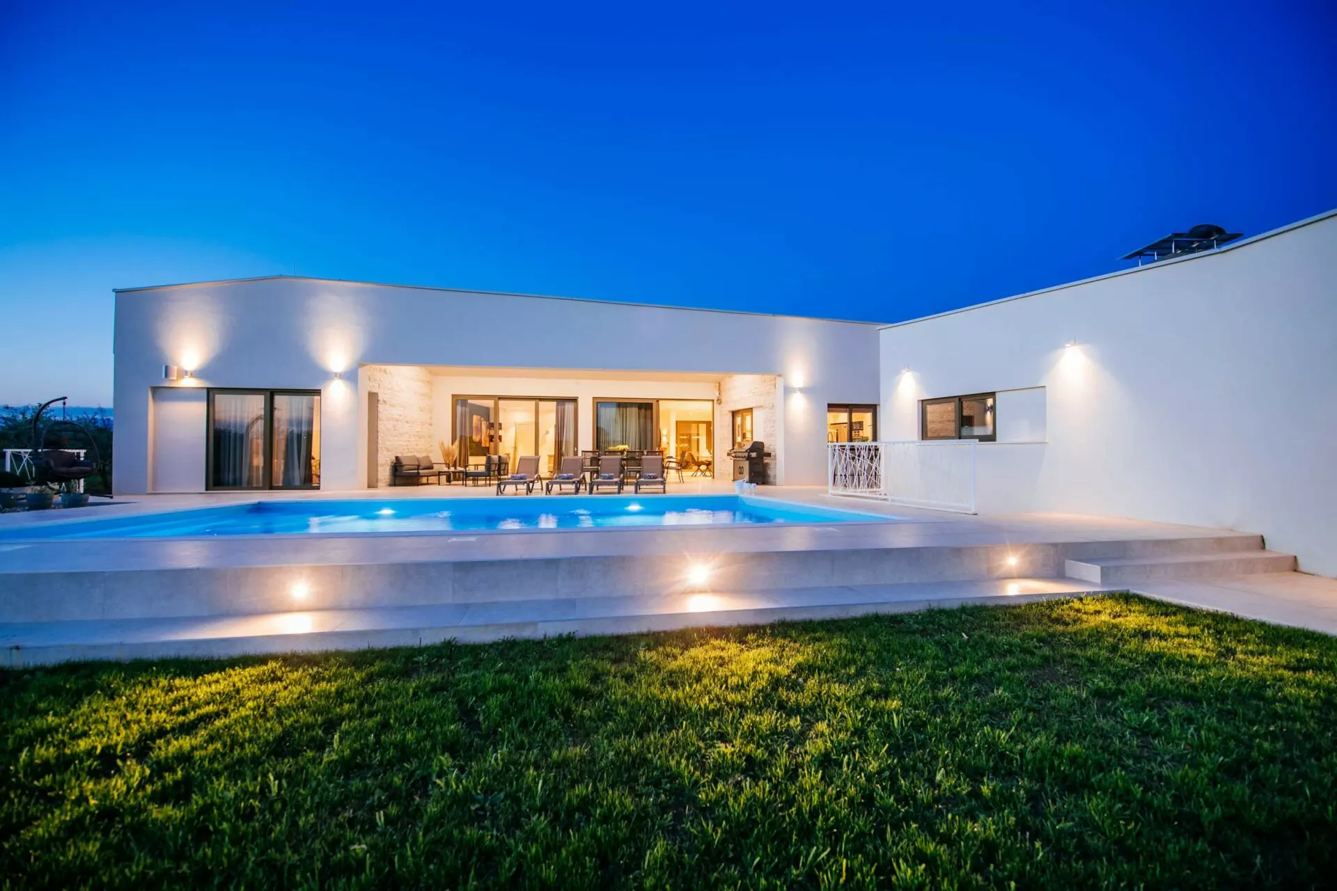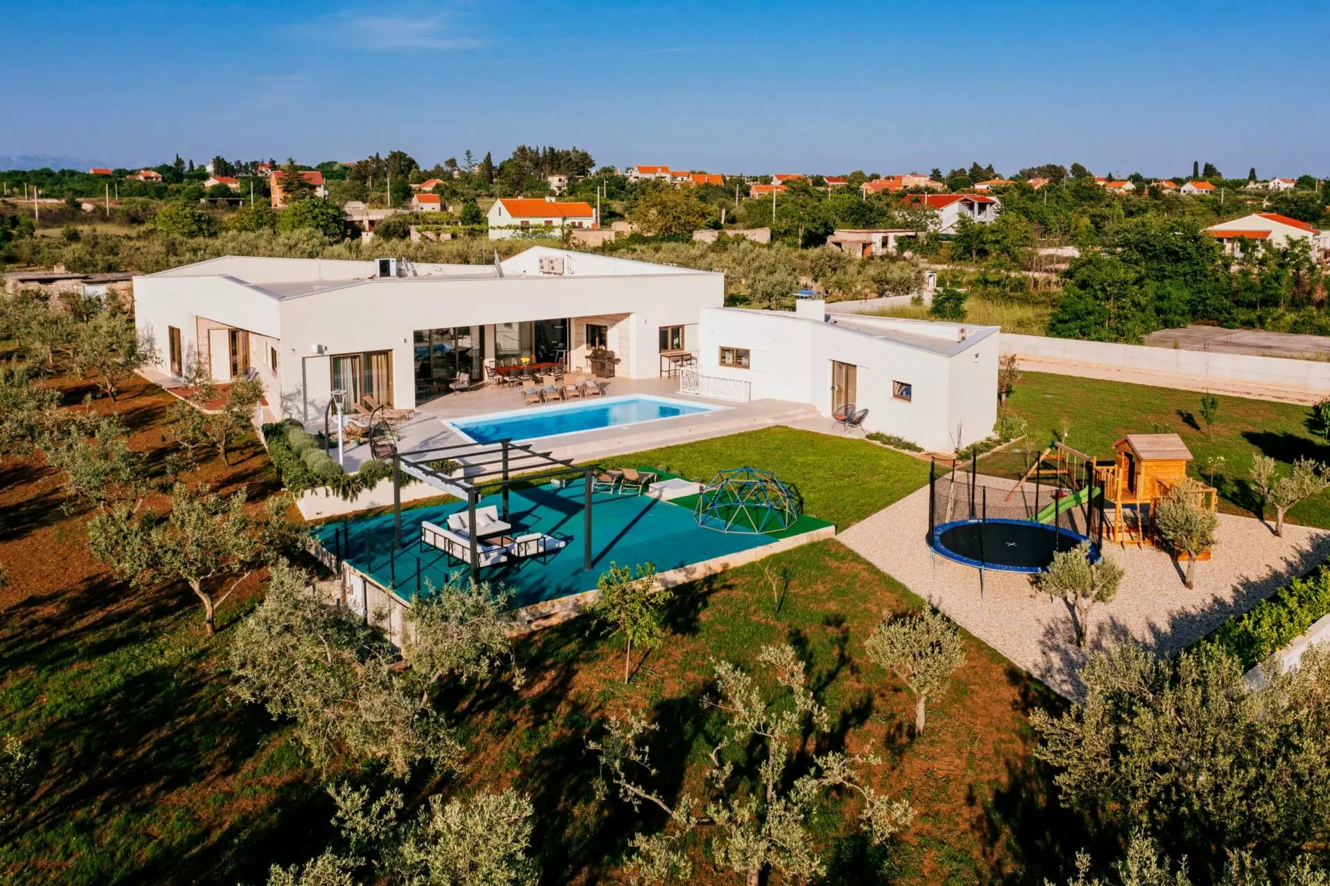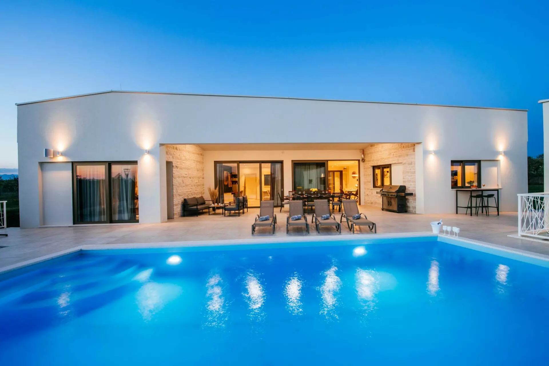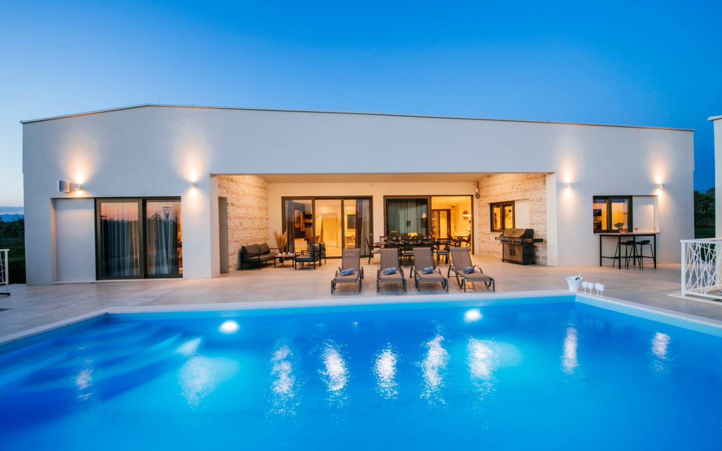 Luxury villa near Zadar, consists of a main and an auxiliary building, in the main building there are 4 rooms with bathrooms, one of which is a master bedroom, guest toilet, kitchen, dining room, living room, laundry room, engine room, garage, and in the auxiliary building there is one bedroom room, social room with fireplace, toilet and tool room.