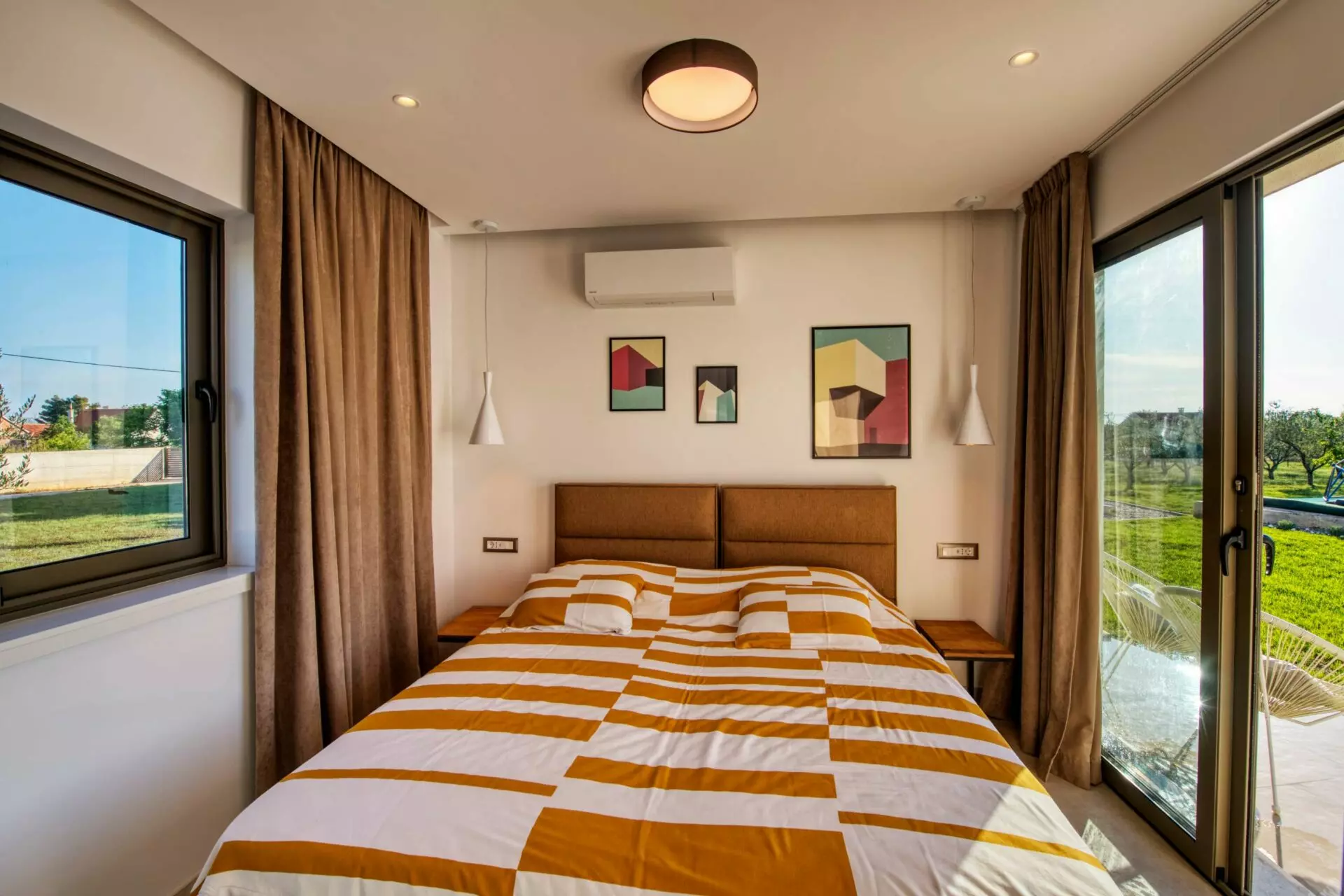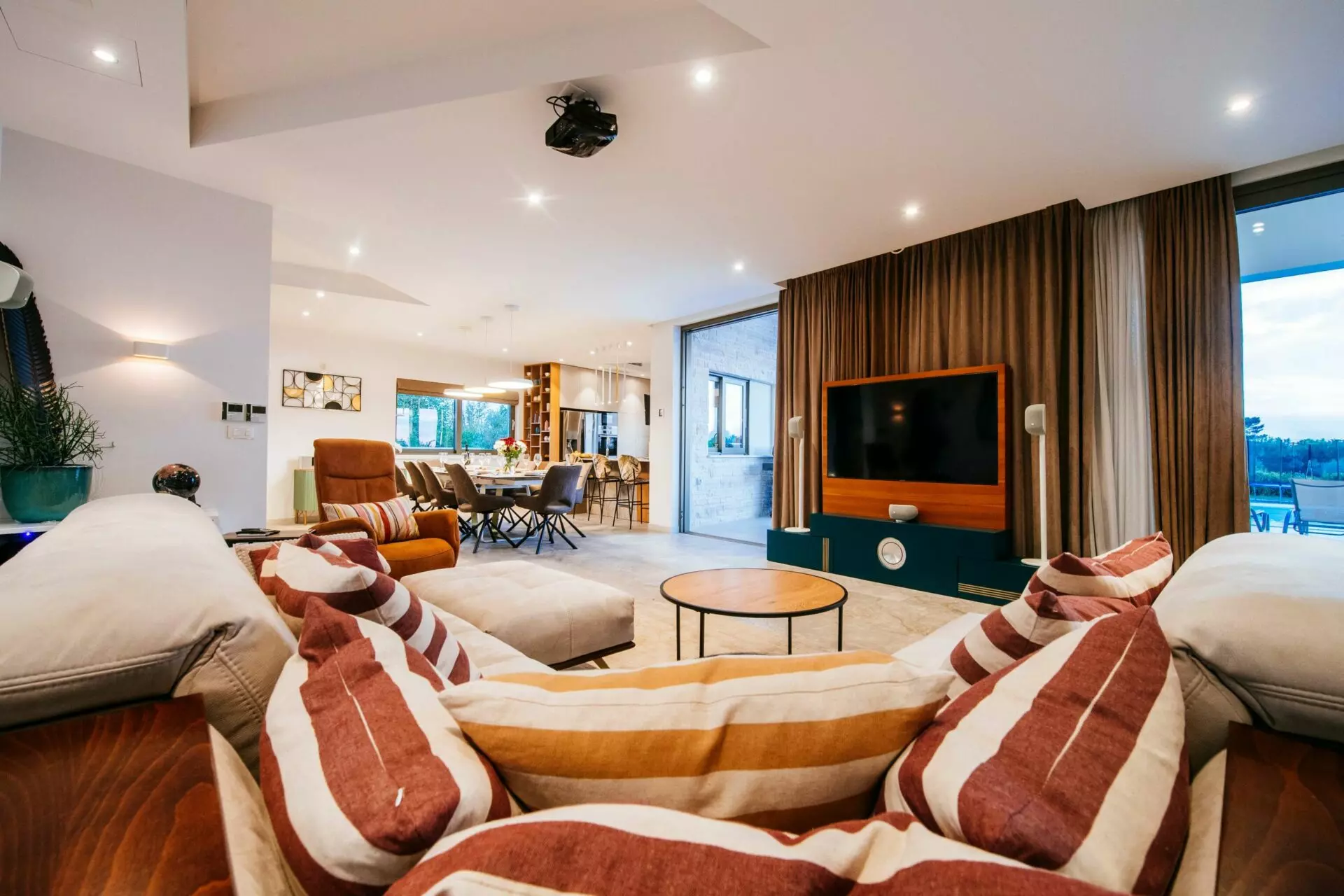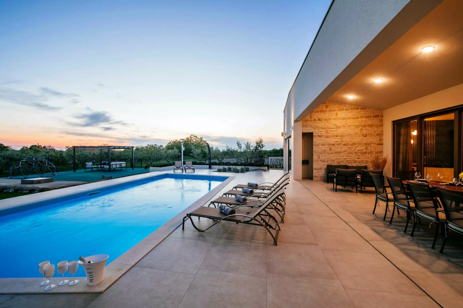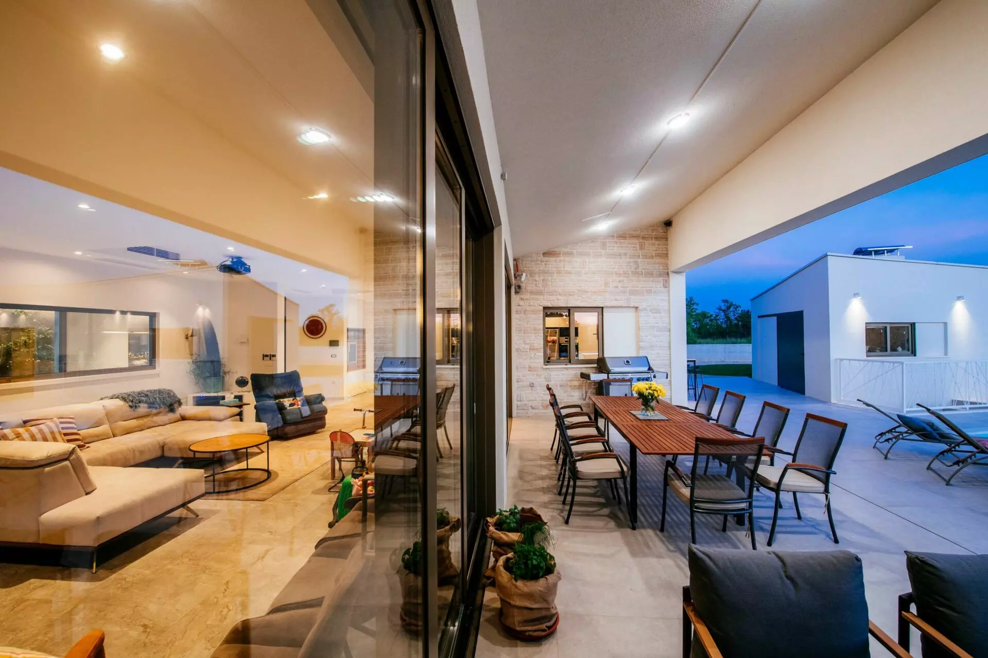 Luxury villa near Zadar, consists of a main and an auxiliary building, in the main building there are 4 rooms with bathrooms, one of which is a master bedroom, guest toilet, kitchen, dining room, living room, laundry room, engine room, garage, and in the auxiliary building there is one bedroom room, social room with fireplace, toilet and tool room.