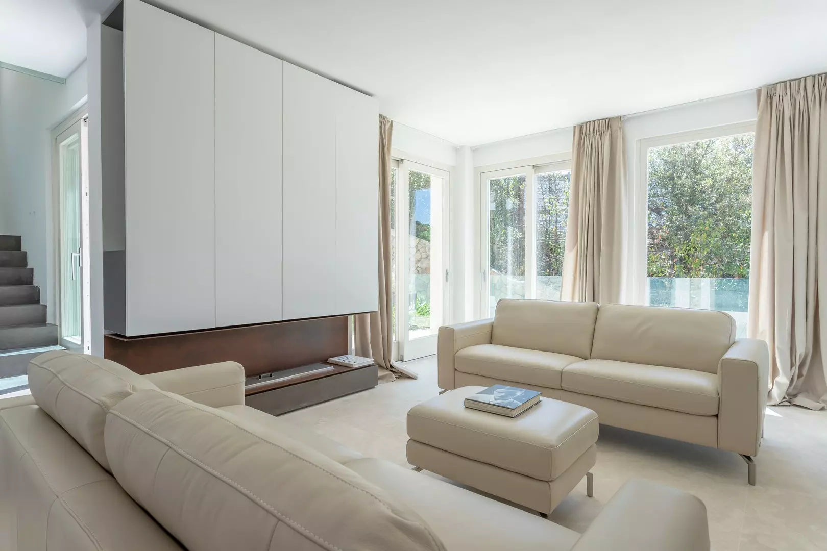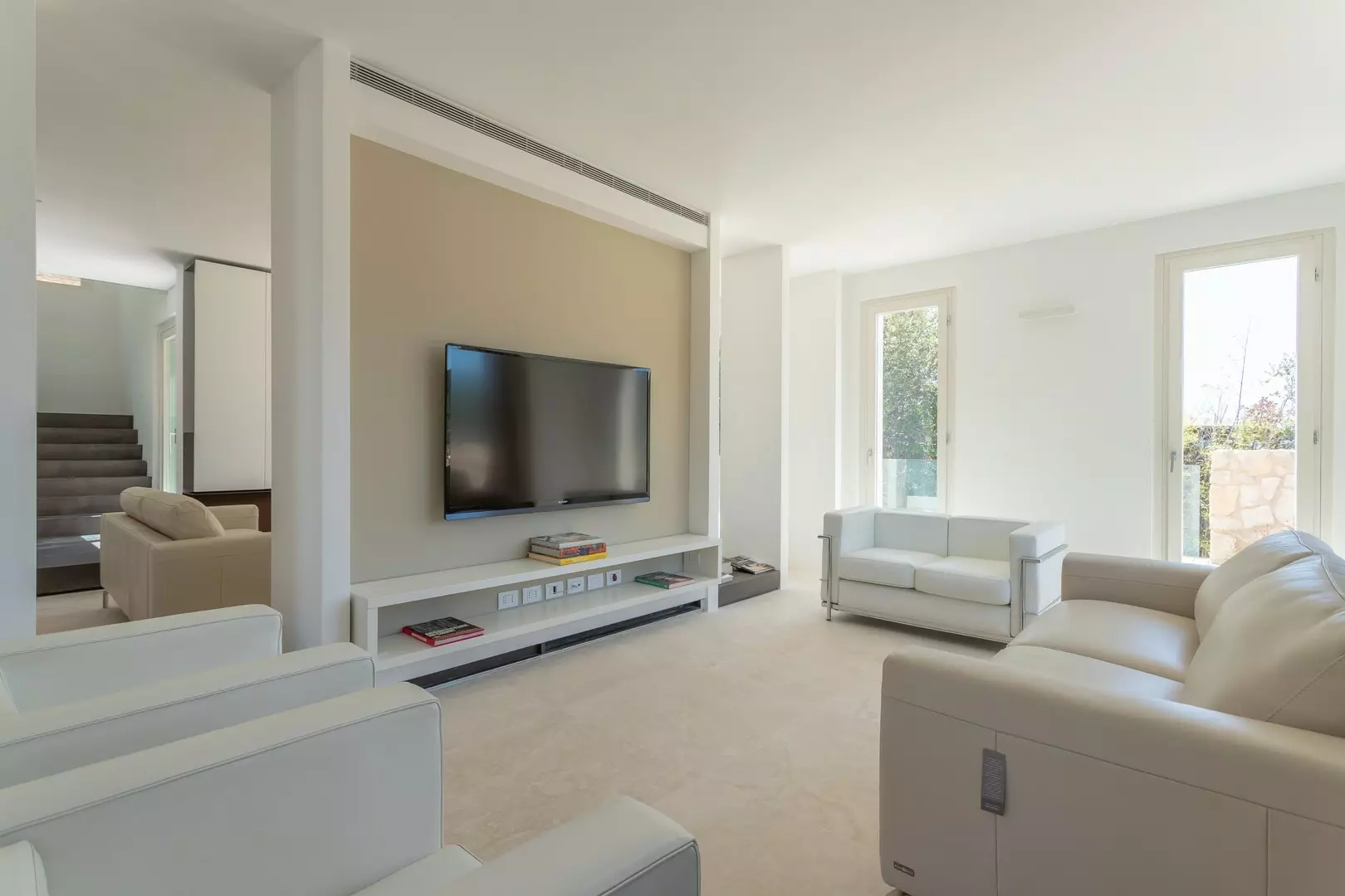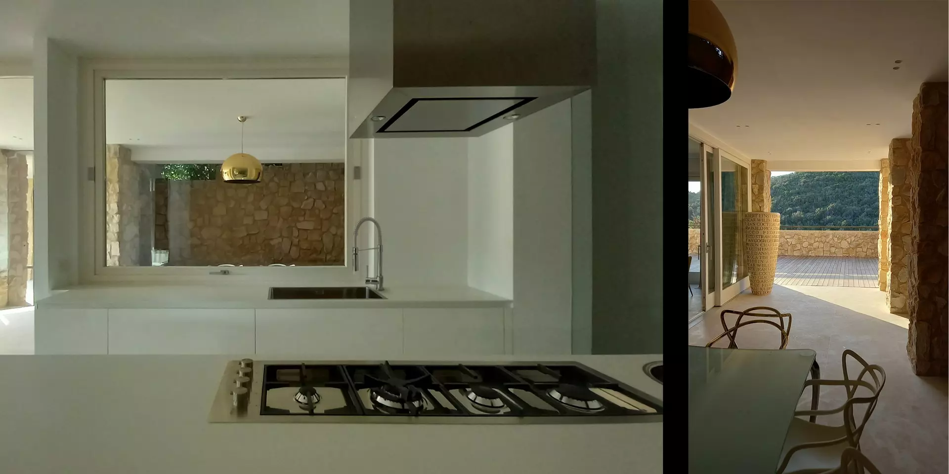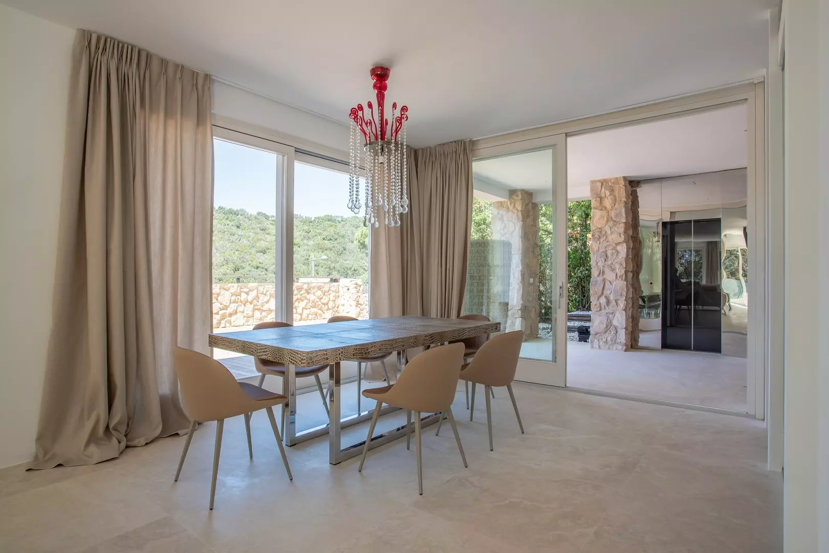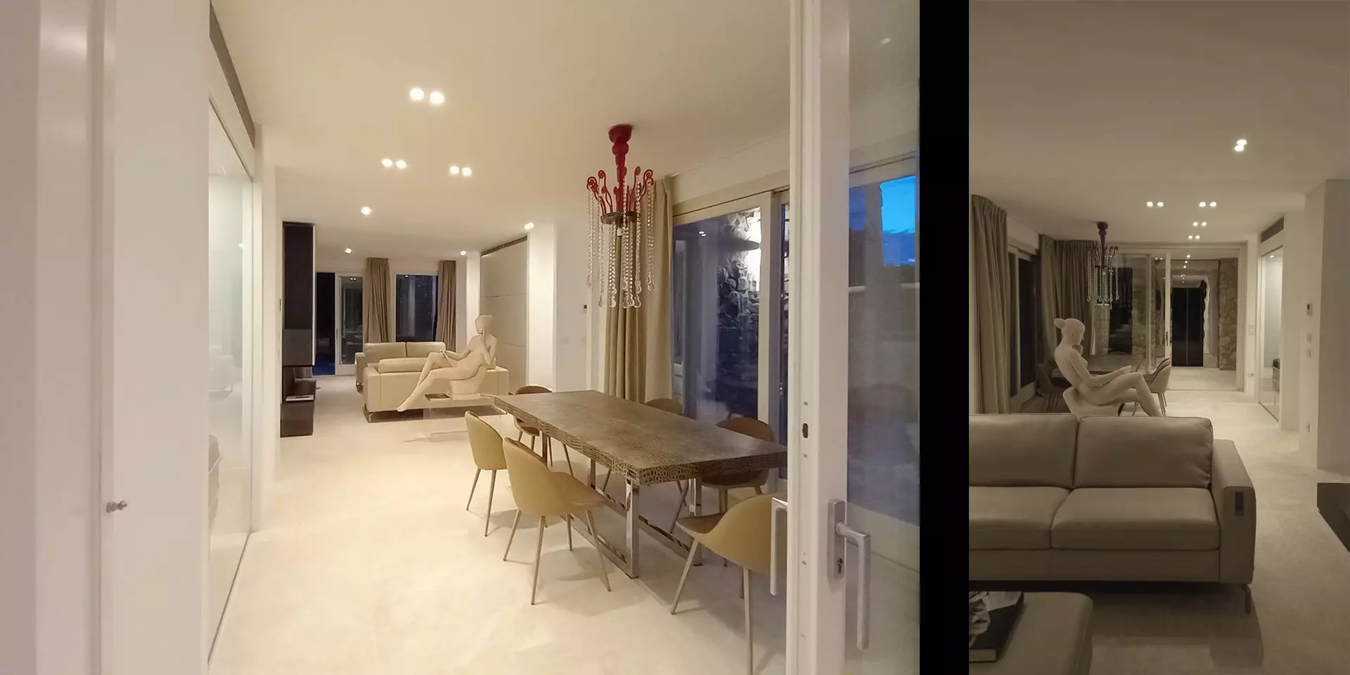 Al piano principale si trovano la zona pranzo e la zona living, caratterizzate da vetrate a tutta altezza, perfette per momenti di relax o per ospitare eventi privati. La cucina è moderna e completamente attrezzata con elettrodomestici di ultima generazione, isola centrale e ampia dispensa. Ideale per chi ama cucinare o desidera uno spazio professionale per uno chef privato.