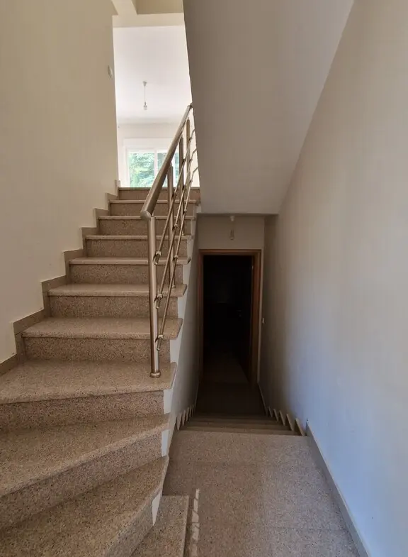 The basement features two storerooms, providing ample storage space for seasonal items or outdoor gear. The ground floor encompasses a living room that integrates with an efficient kitchen layout, complemented by a shower WC for convenience.