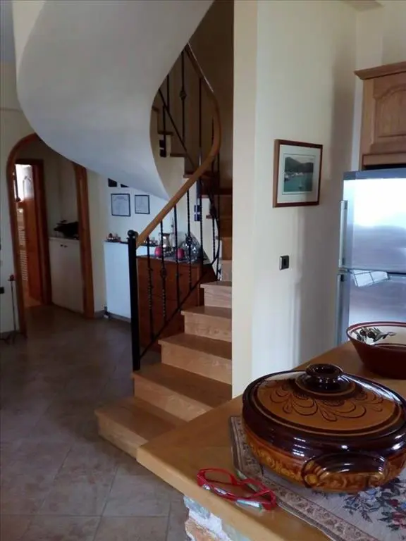 The maisonette boasts windows that offer a view of the city, sea, and mountains, allowing natural light to brighten the living spaces. The property is equipped with heating and awnings, adding to its functionality. Additionally, a fireplace can be found, which may serve as a focal point during colder months.