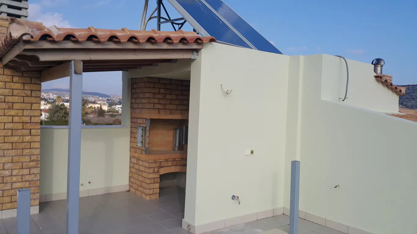 This maisonette offers a view of the city, sea, mountains, and forest from its windows, providing a scenic backdrop. Some energy-efficient amenities are included, such as solar panels dedicated to water heating.