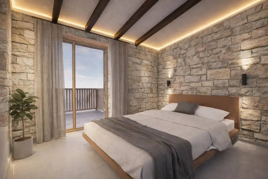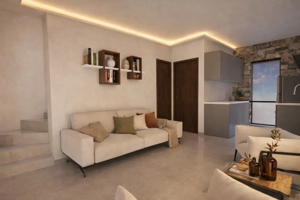 For sale under construction maisonette of 64 sq.meters in Kassandra, Chalkidiki. The maisonette has 2 levels. Ground floor consists of living room with kitchen, one shower WC. 1st floor consists of 2 bedrooms, one shower WC.