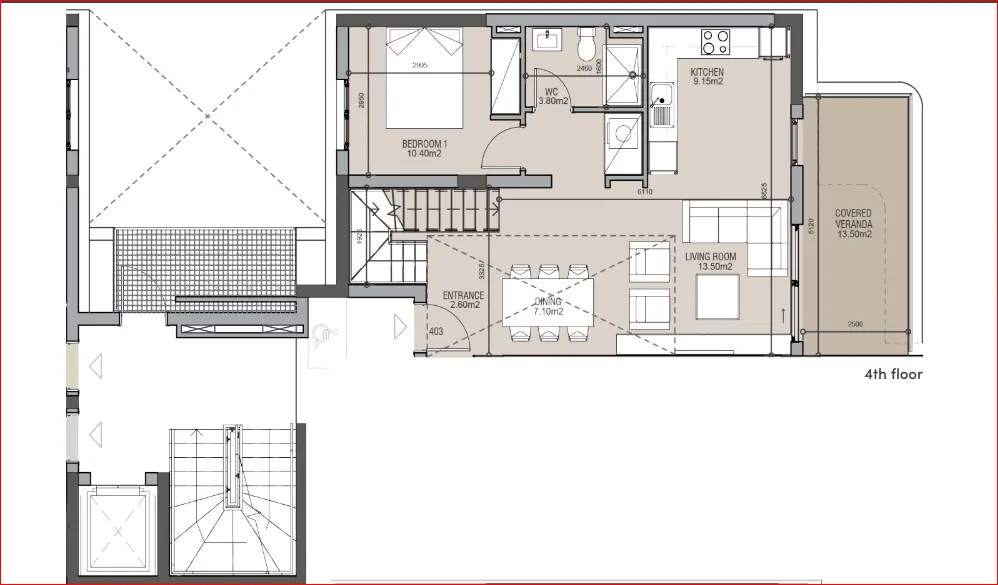 The maisonette’s fourth floor features a thoughtful layout that includes one bedroom, a living room that opens into a kitchen, and a shower WC for convenience. Moving up to the fifth floor, you’ll find two additional bedrooms along with another shower WC. This design maximizes space while providing essential amenities.