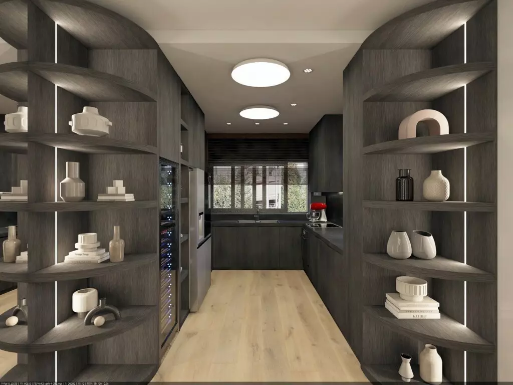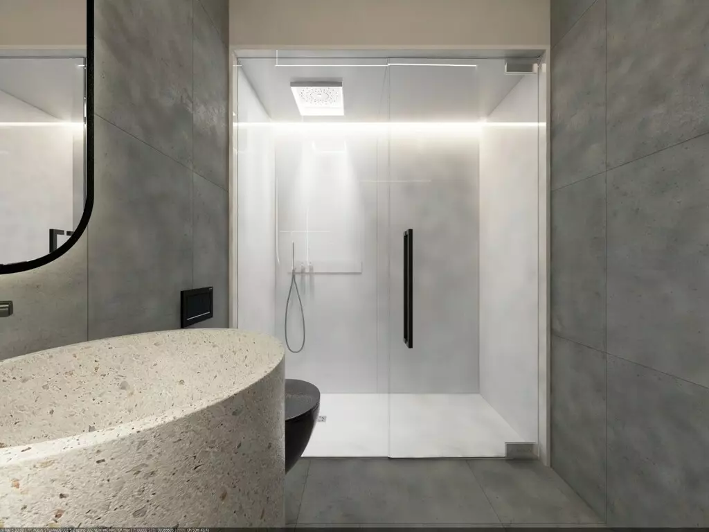 The semi-basement level is designed for convenience and usability. It features one bedroom, a compact kitchen, a shower WC, and an office space, making it ideal for both living and working. The ground floor unfolds into a combination living room and kitchen area, providing an open environment for daily activities.