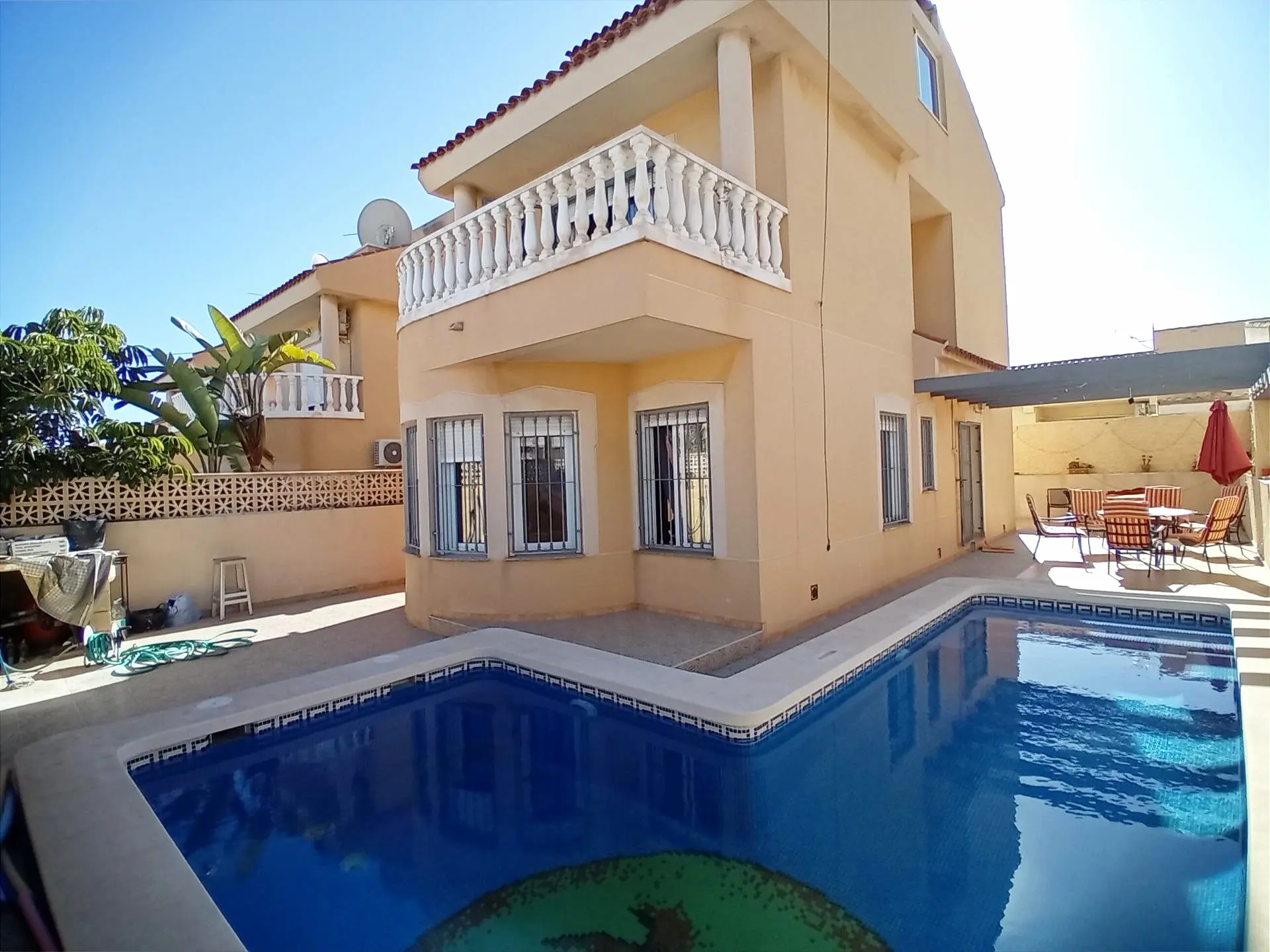 The property boasts a private L-shaped pool and multiple terraces. These outdoor spaces are geared toward year-round use, featuring areas that are shaded during the summer and receive sun during winter months. They provide ample room for an outdoor kitchen or barbecue setup, encouraging a connection between indoor and outdoor living.
