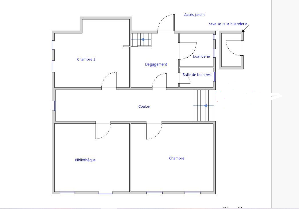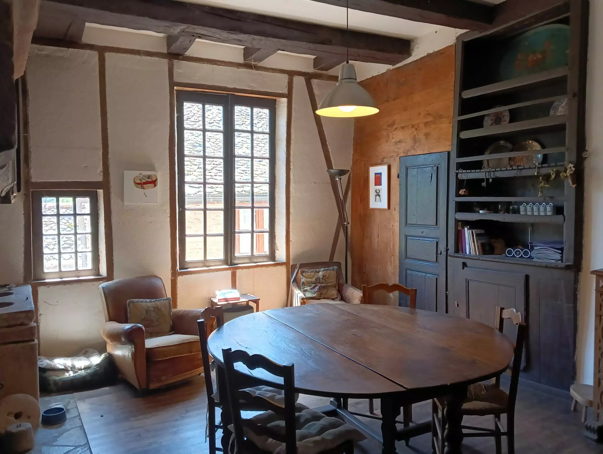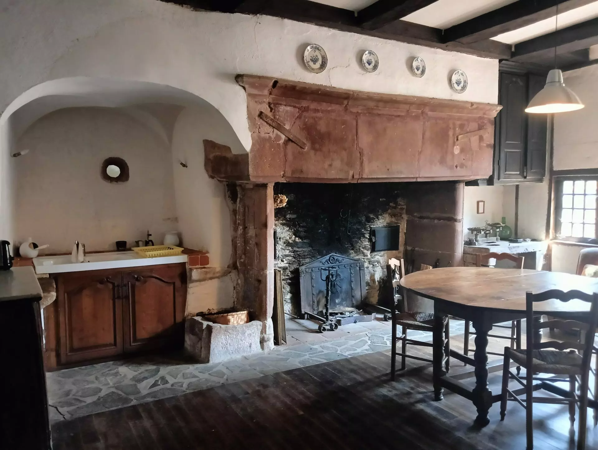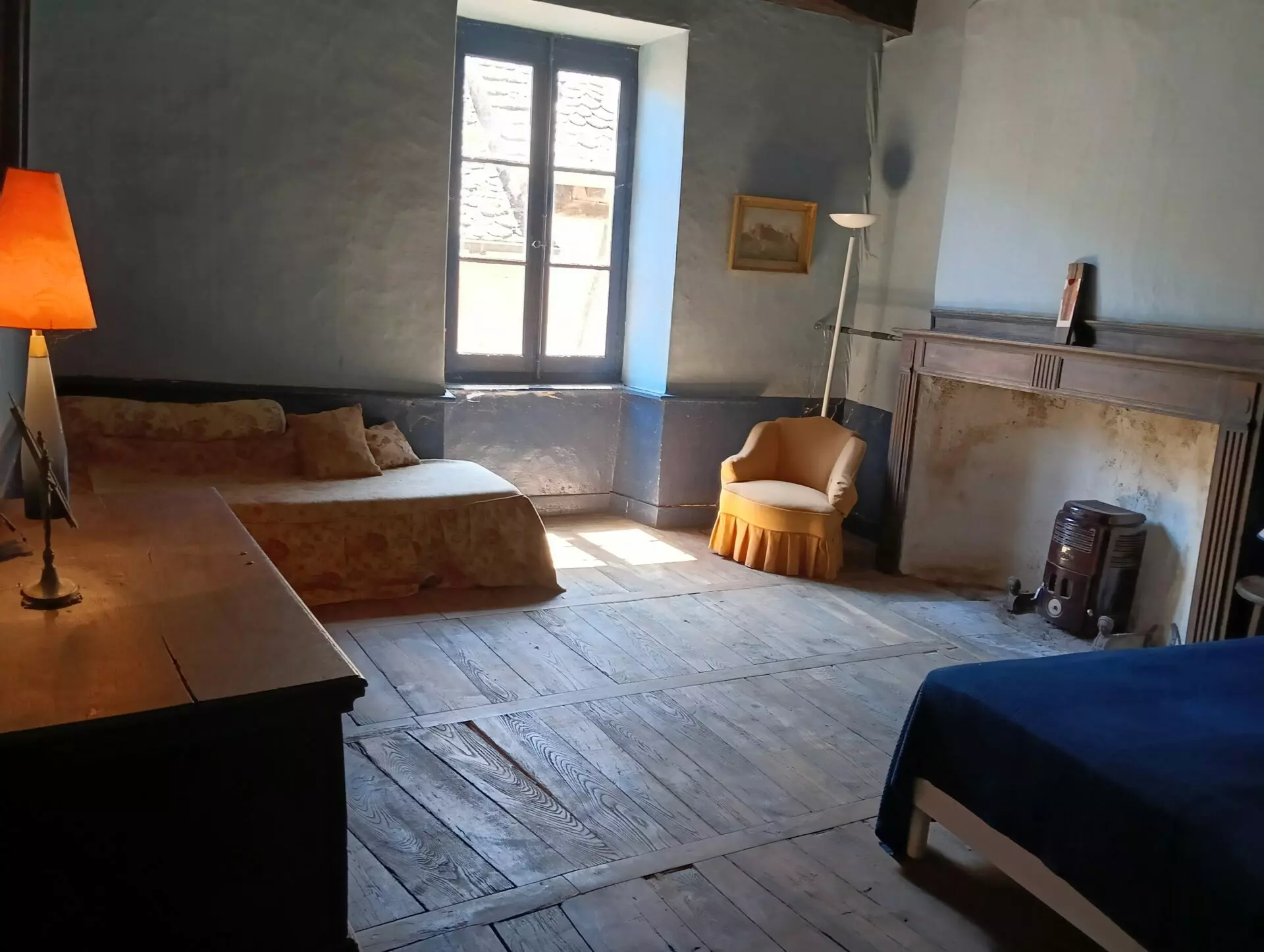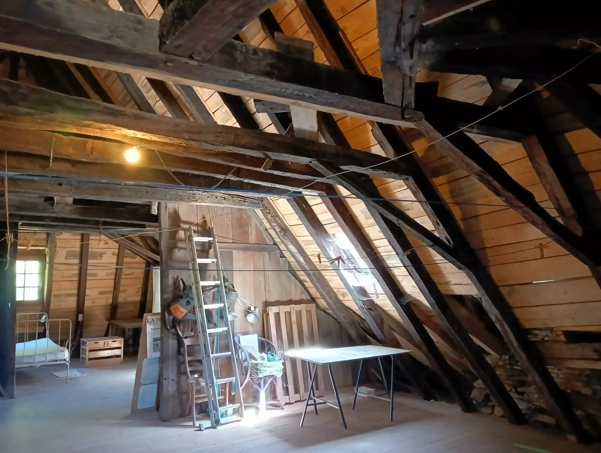 Au cœur de la maison, une superbe cuisine/salle à manger avec sa cheminée en pierre rouge, son évier ancien, sa souillarde et son petit cellier suspendu au dessus de l’escalier (certainement un ancien monte-charges). On y trouve également une belle et grande chambre, une salle de bains avec WC, et une pièce à aménager. Par un bel escalier, on arrive au second niveau. Un large couloir dessert deux grandes chambres, un salon ”bibliothèque” baigné de lumière, une petite chambre et une salle d’eau avec WC. Ce dégagement dispose également d’un coin buanderie, d’un accès direct au jardin ainsi qu’un escalier vers les combles. Le vaste grenier, en bois de châtaignier, offre un potentiel exceptionnel pour un atelier d’artiste ou la création d’espaces supplémentaires.