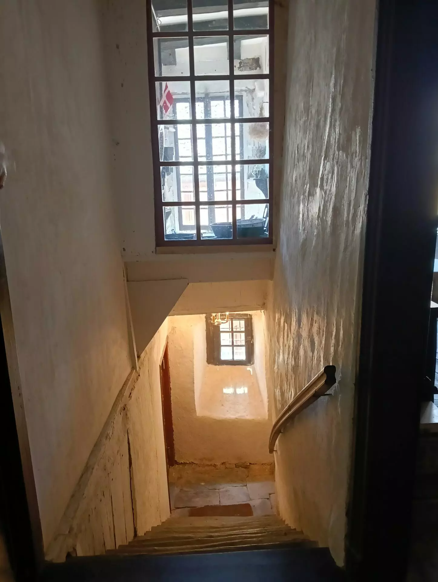 Au rez-de-chaussée, une ancienne échoppe, accessible depuis la rue ou l’intérieur de la maison, témoigne du passé artisanal du lieu : on peut facilement y imaginer le travail d’un cordonnier médiéval. Elle s’ouvre sur une vaste cave voûtée avec puits, idéale pour une activité artistique ou une galerie.