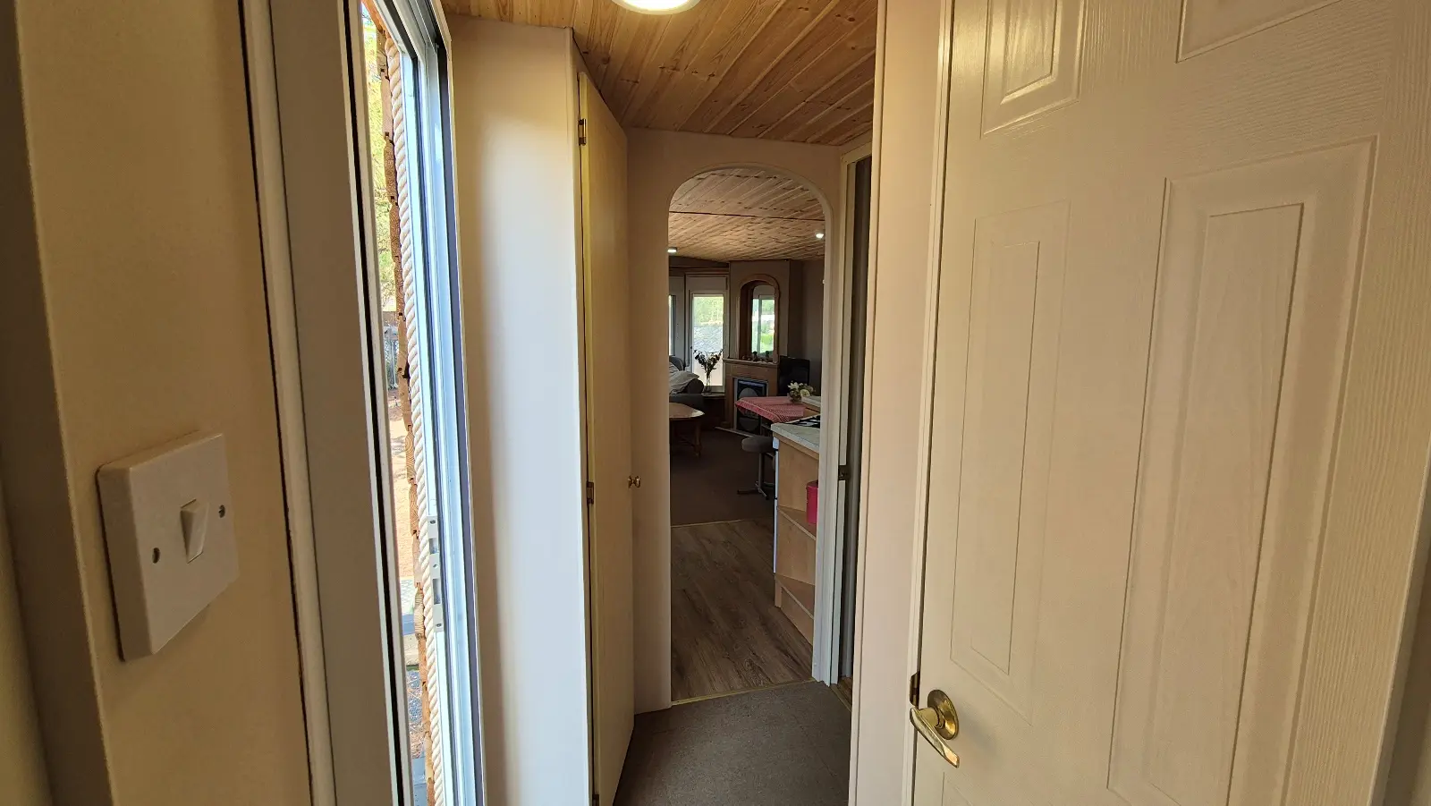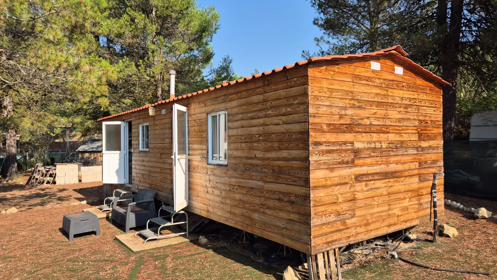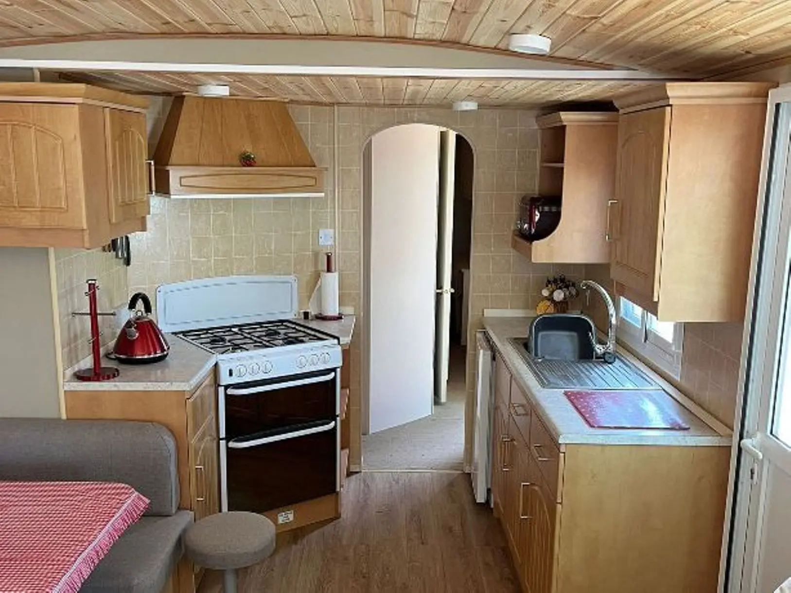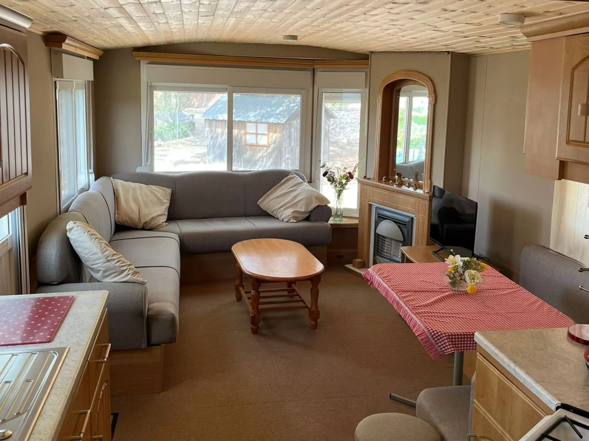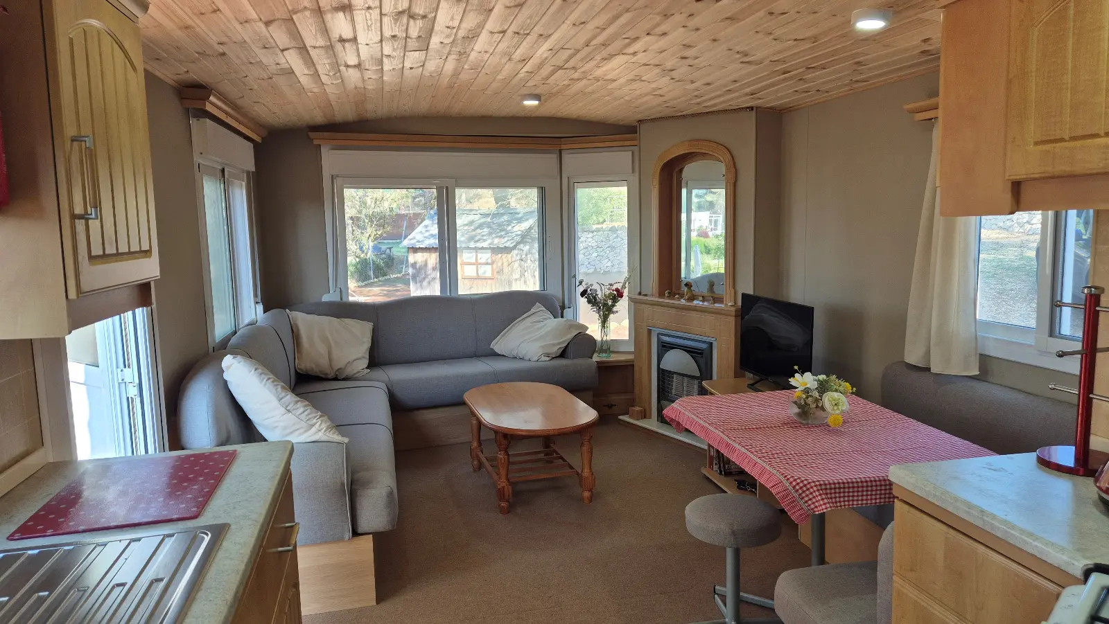 The mobile home itself is elevated approximately 50 cm above ground and is mounted on wheels, allowing for easy relocation if desired. The home has two access doors: one leading into a living area equipped with a gas cooker and a lounge that can be readily converted into a double bedroom. The sofas have been recently refreshed and reupholstered.