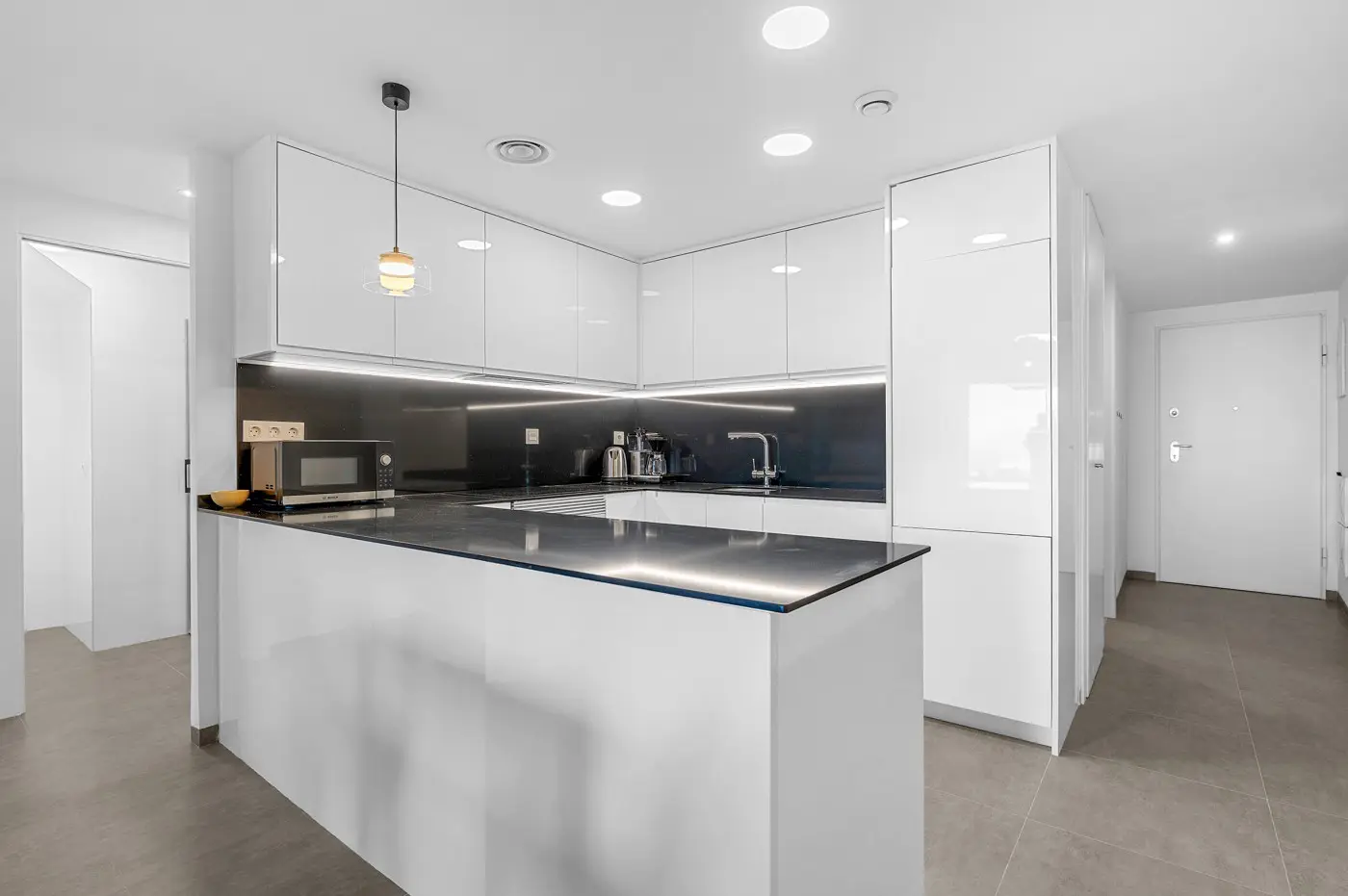 Inside, the property features a total of 86 m² of thoughtfully designed living space. The apartment includes three bedrooms, each equipped with fitted wardrobes for practical storage solutions. There are two bathrooms finished to a high standard, catering to modern living standards. The open-plan living and dining area is designed to maximize natural light through expansive windows, enhancing the bright atmosphere and showcasing the stunning scenery outside. Residents can access a private terrace and balcony from this space, allowing for an extension of the living area outdoors.