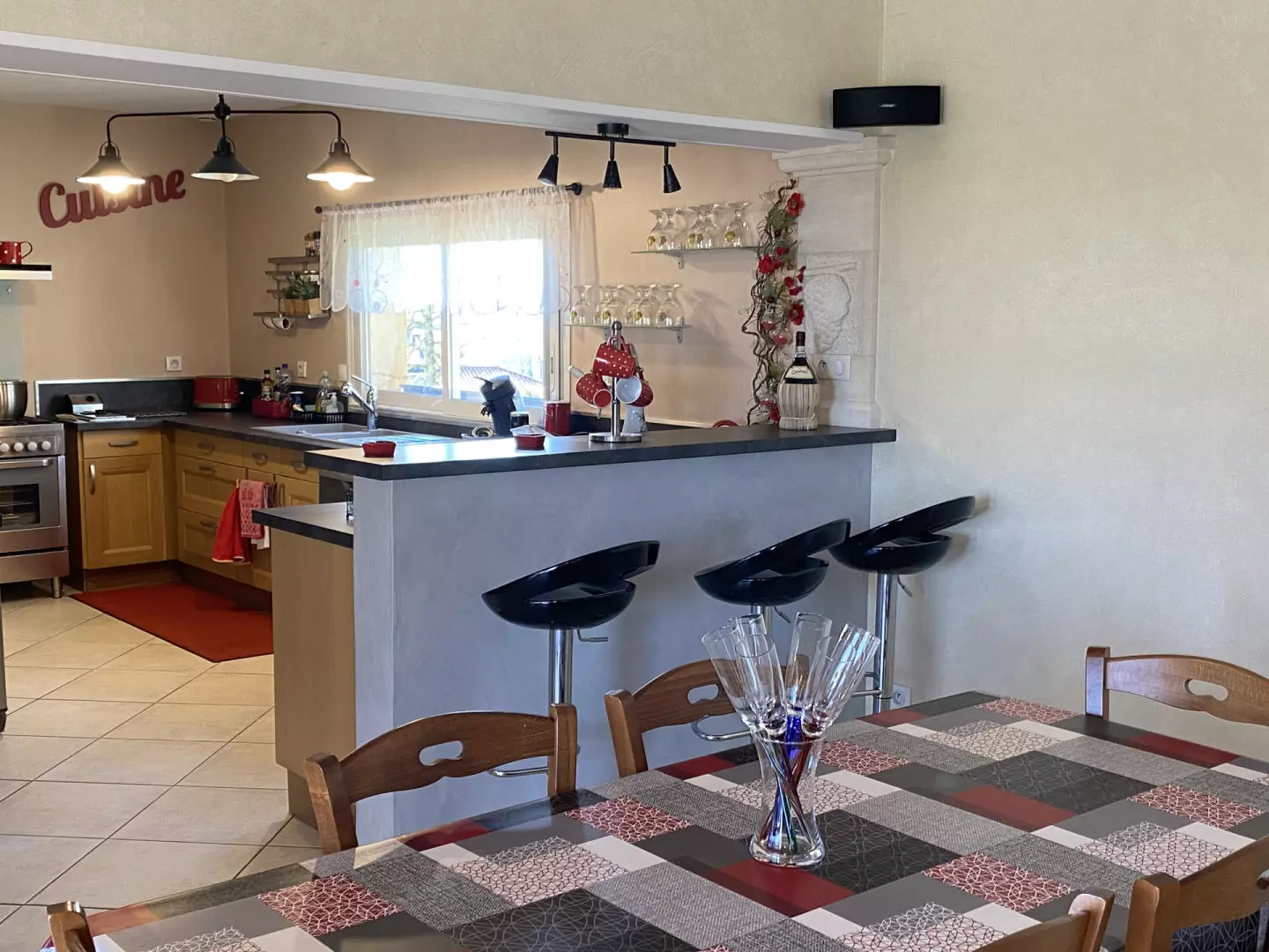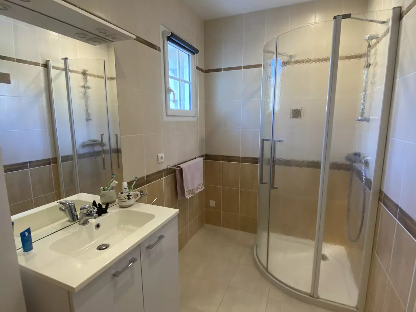 The main house features a layout that includes an entrance hall, a study, and a kitchen that opens into a living and dining area. This space includes a traditional fireplace as well as a wood burner, adding functionality. The ground floor also accommodates three bedrooms, two separate toilets, and a shower room that is accessible both from the master bedroom and the corridor. For outdoor entertaining, French doors lead from the main living area to the terraces equipped with a barbecue.