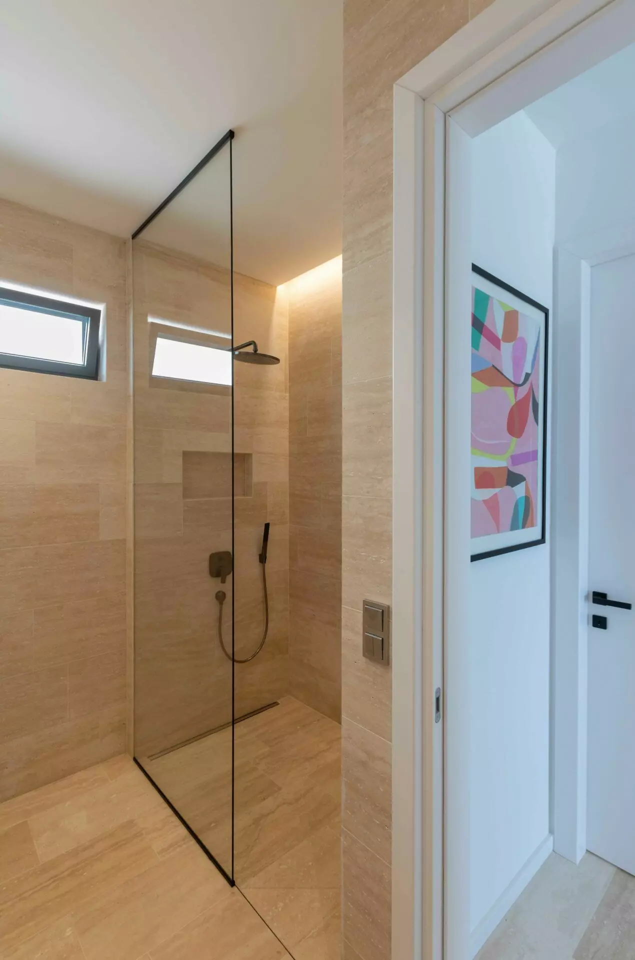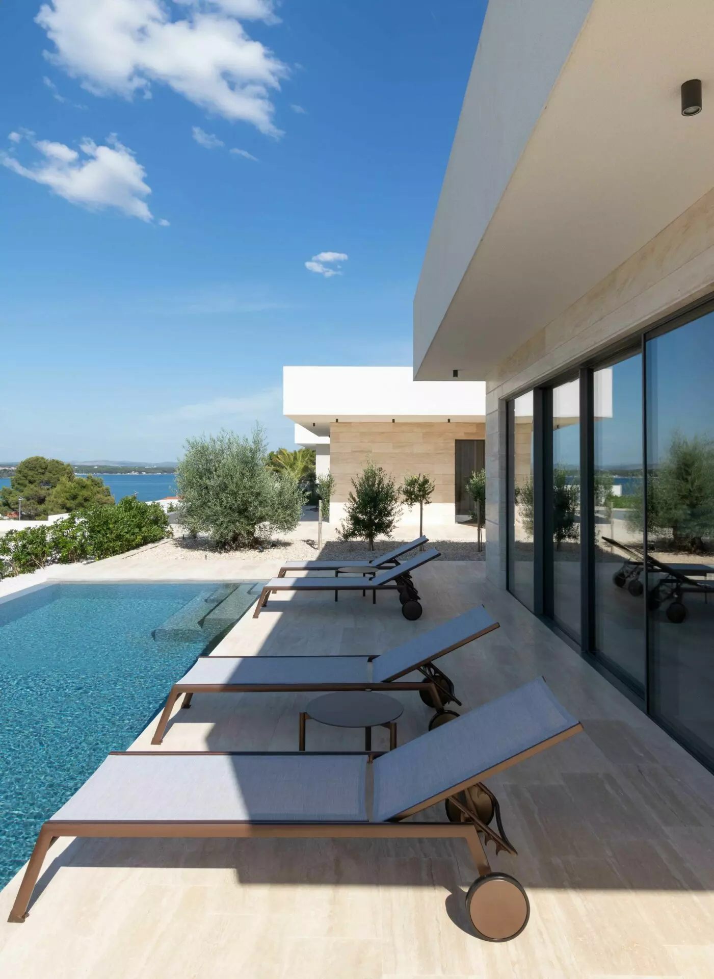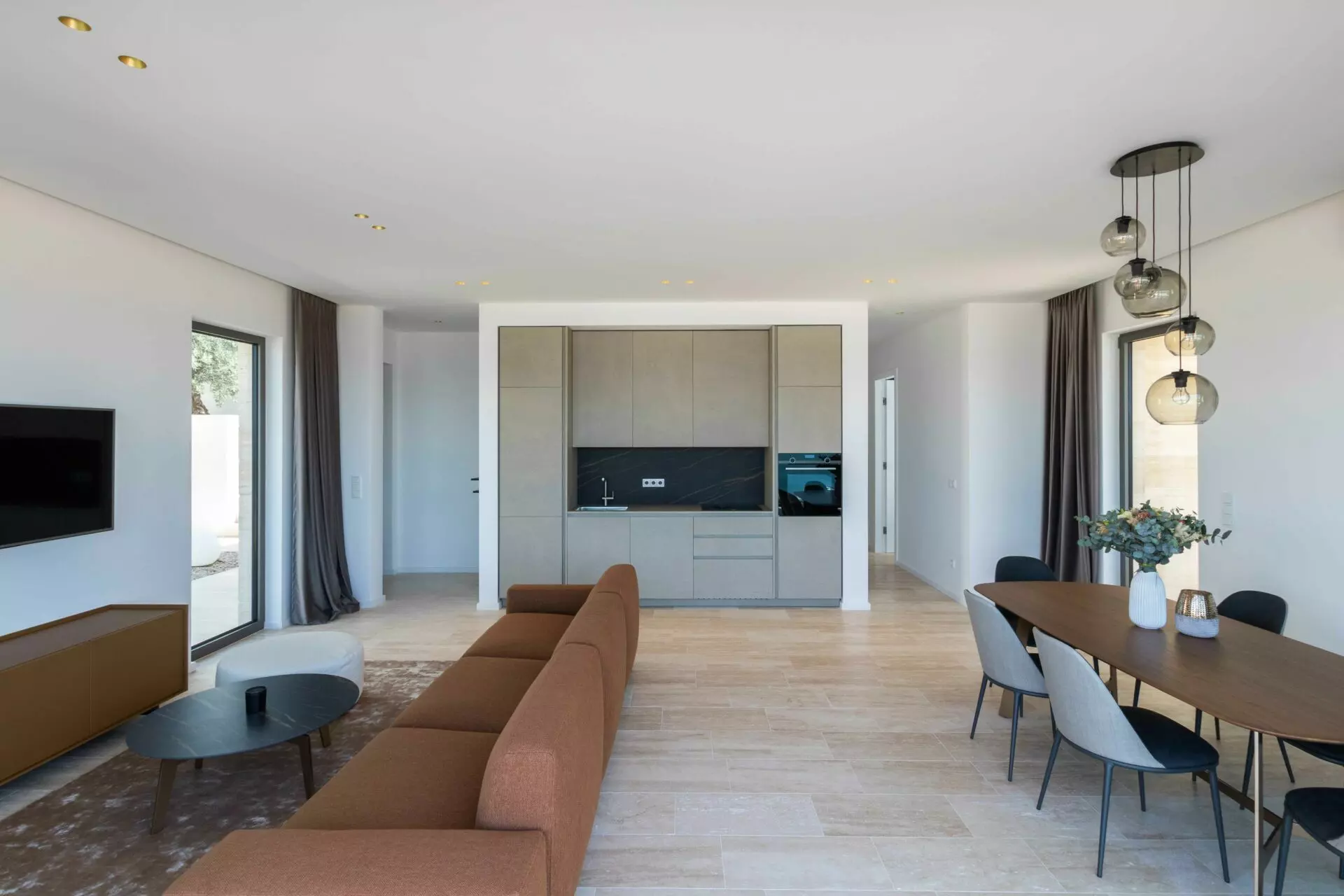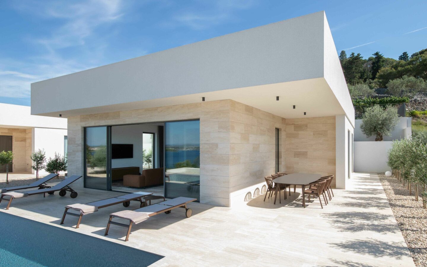 The interior is finished to the highest standards – cement plastered walls, smooth surfaces, and travertine stone floors that seamlessly match the exterior design. Top-quality aluminum joinery by Cortizo (Cor Vision Plus model) enhances the luxurious and airy feel of the space.