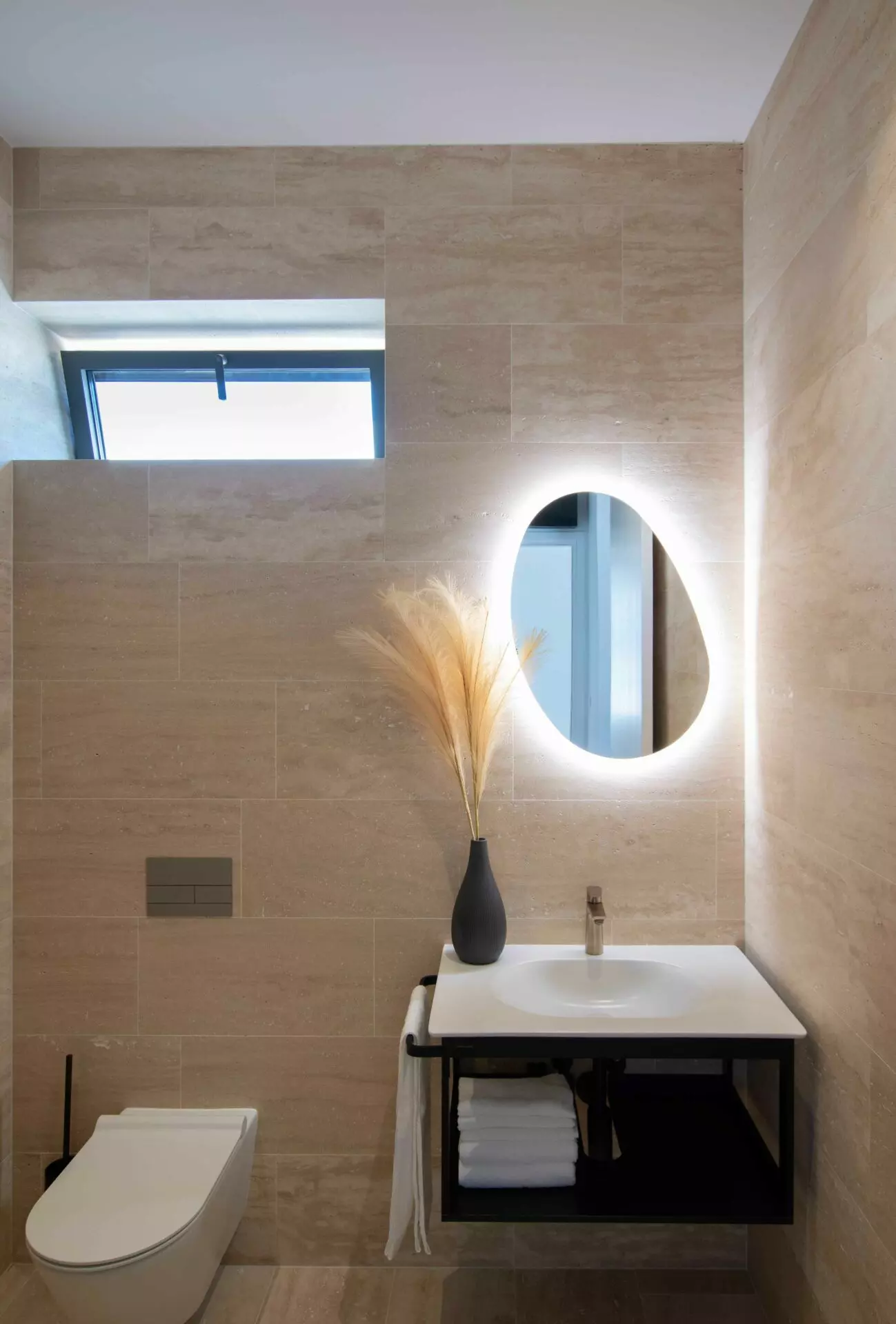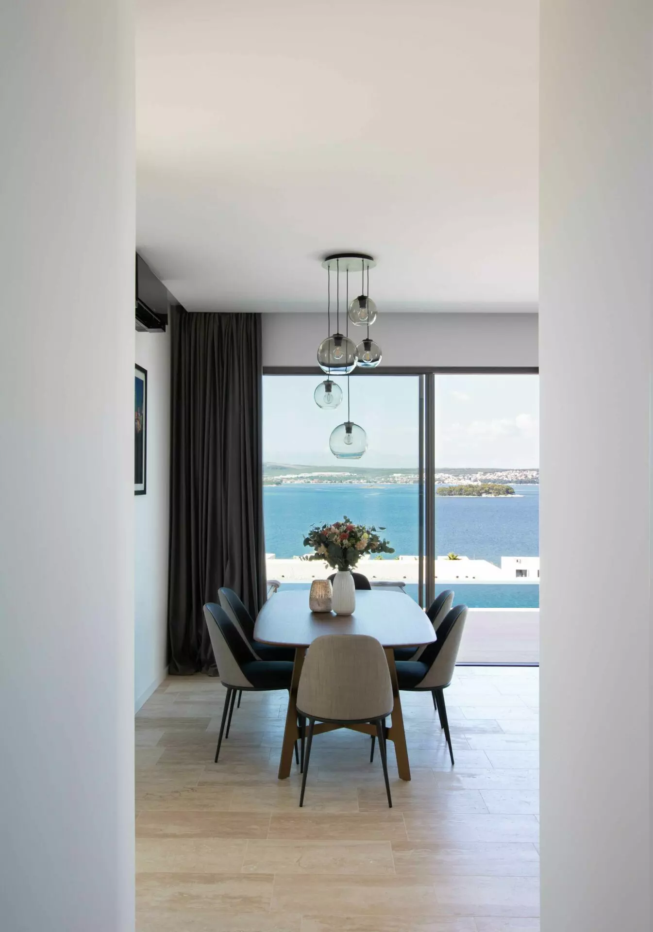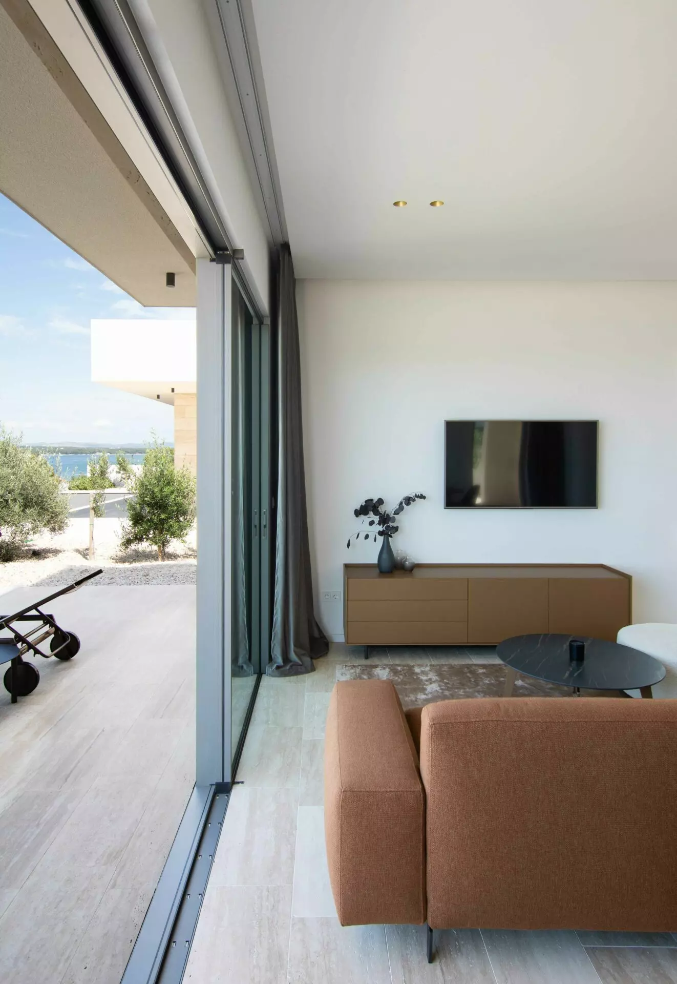 The interior is finished to the highest standards – cement plastered walls, smooth surfaces, and travertine stone floors that seamlessly match the exterior design. Top-quality aluminum joinery by Cortizo (Cor Vision Plus model) enhances the luxurious and airy feel of the space.