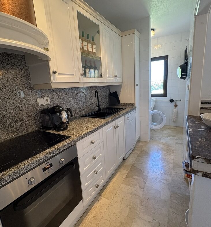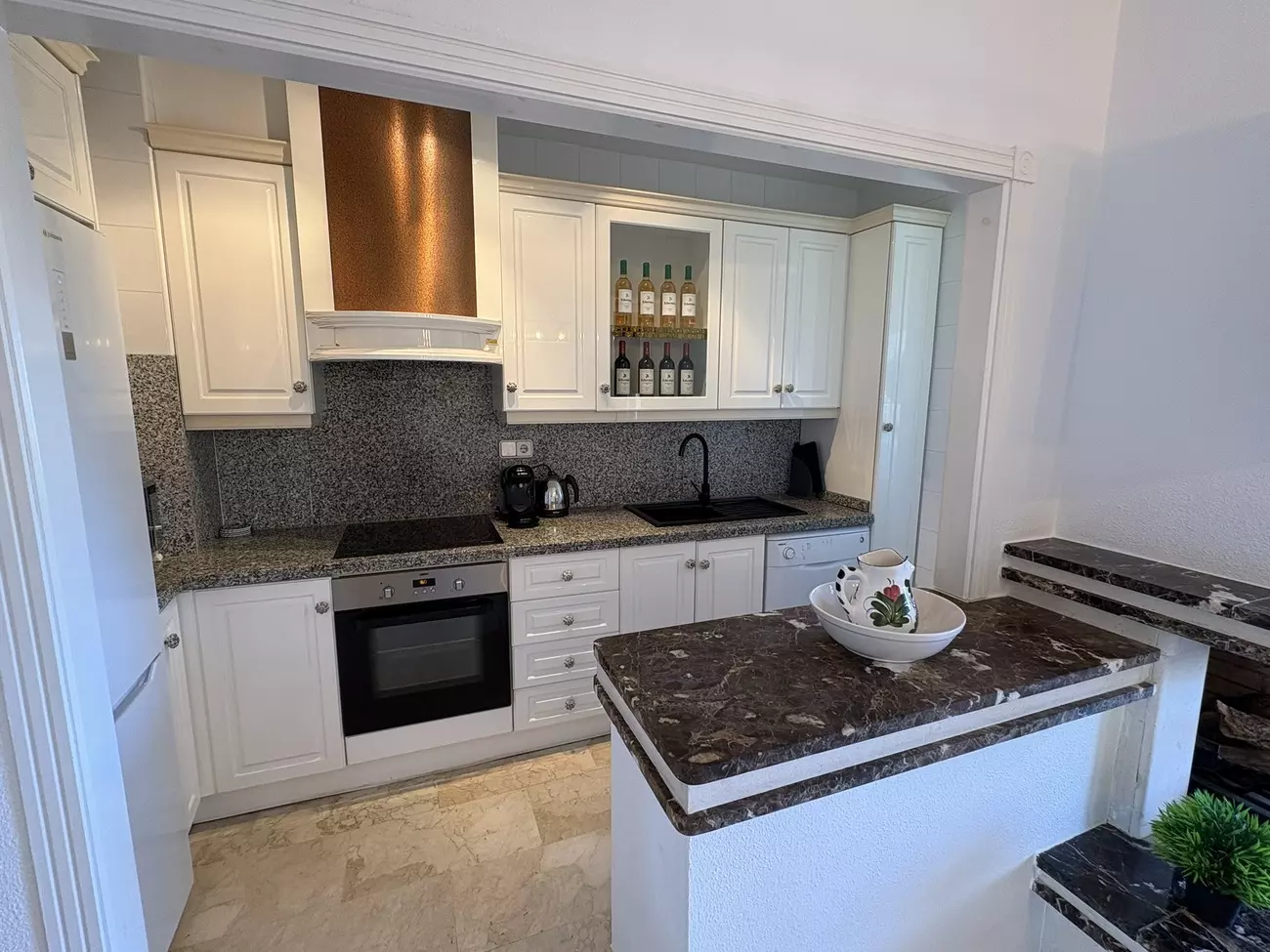 This apartment effectively uses its two stories to create a functional living environment. Upon entering, you will find a bright living and dining area that connects seamlessly to a fully equipped galley kitchen. This open-plan layout promotes a sense of space and openness. For those cooler evenings, there is a natural open fireplace that adds to the functional design of the space.
