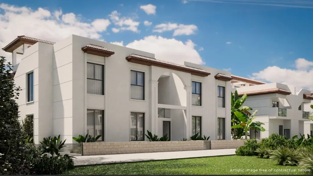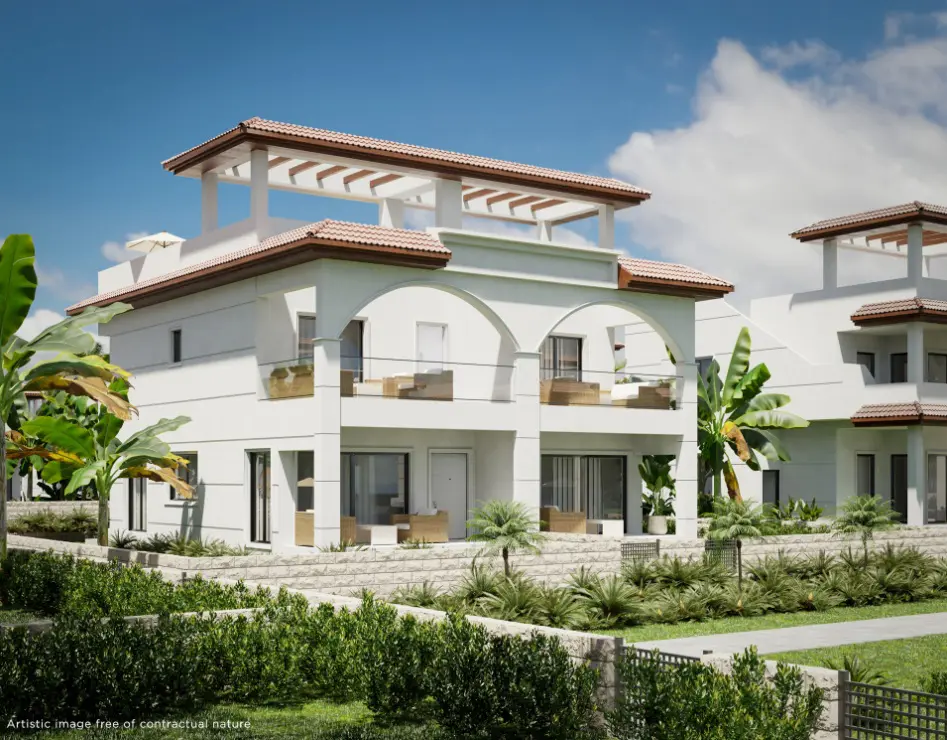 This development stands out with its atrium-style architecture. The buildings are arranged around a long communal pool, which enhances the outdoor atmosphere. Each penthouse provides views from the upper private solarium or garden, making outdoor space a key feature. The properties are thoughtfully designed to maximize natural light and offer a connection to the surrounding environment.