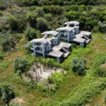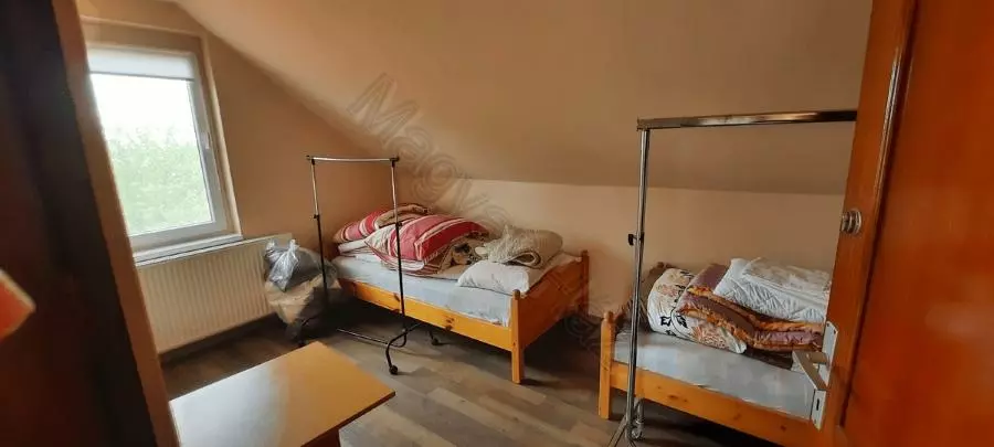 The main building spans three floors. On the first floor, you will find a hallway, a living room, two bedrooms, a kitchen, and a bathroom. The arrangement of rooms enhances the functionality of the space. The second floor includes three additional bedrooms, another kitchen, and another bathroom, ensuring enough facilities for large groups or families.