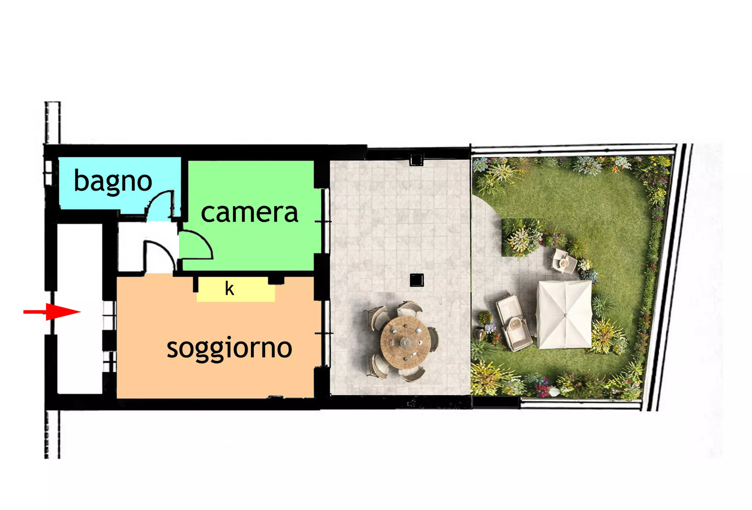 Abitazione SL 43 mq Porticato/Terrazzo 31 mq Giardino 33 mq Box auto 18 mq