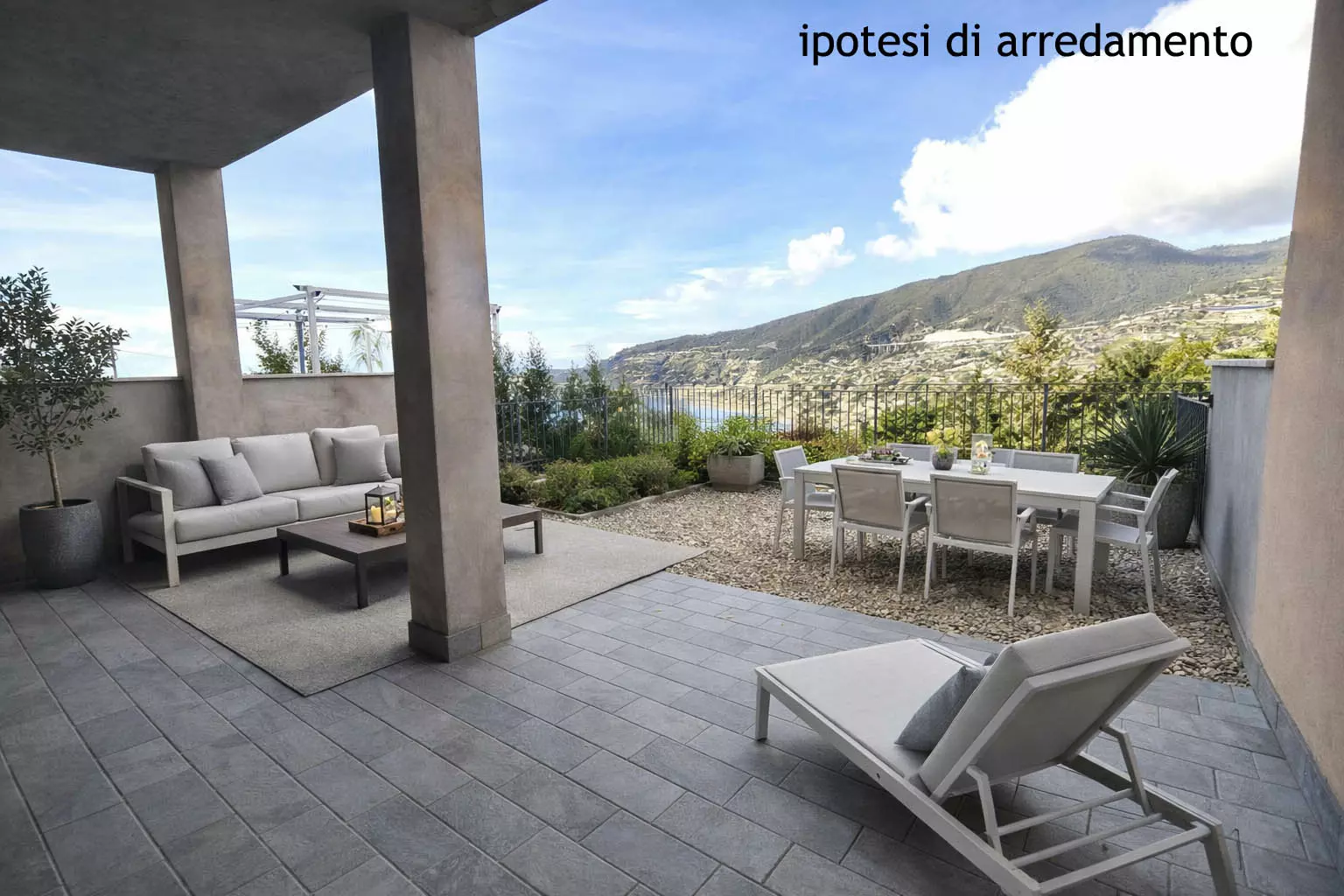 Porticato esterno, terrazzo e giardino progettati per una fruizione continuativa degli spazi all’aperto, valorizzando il clima temperato della Riviera dei Fiori e l’ampia vista mare in ogni periodo dell’anno.