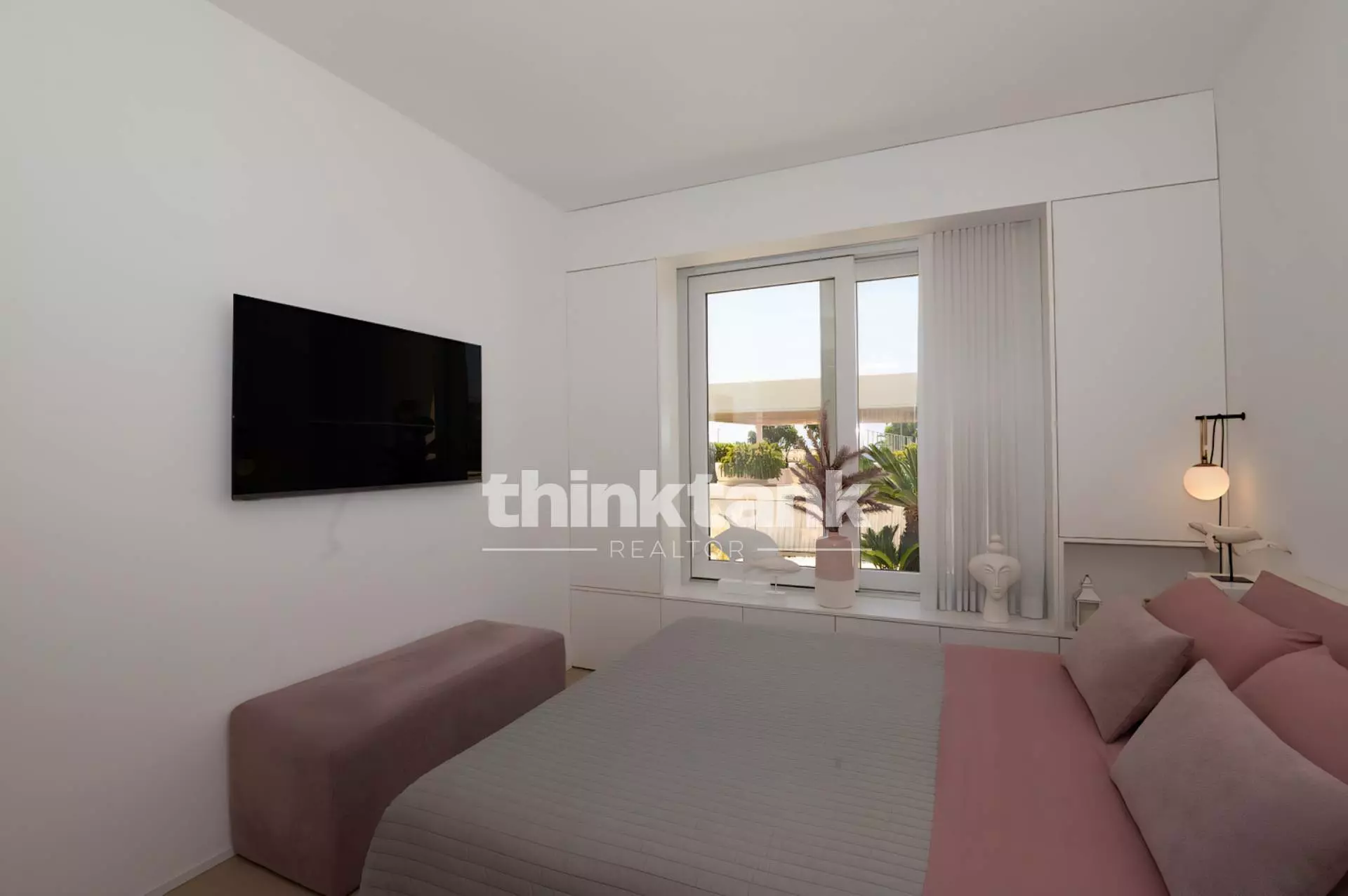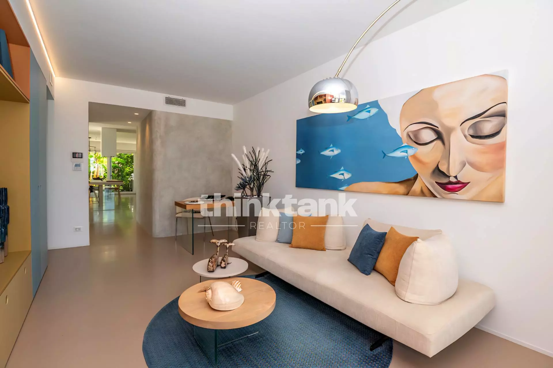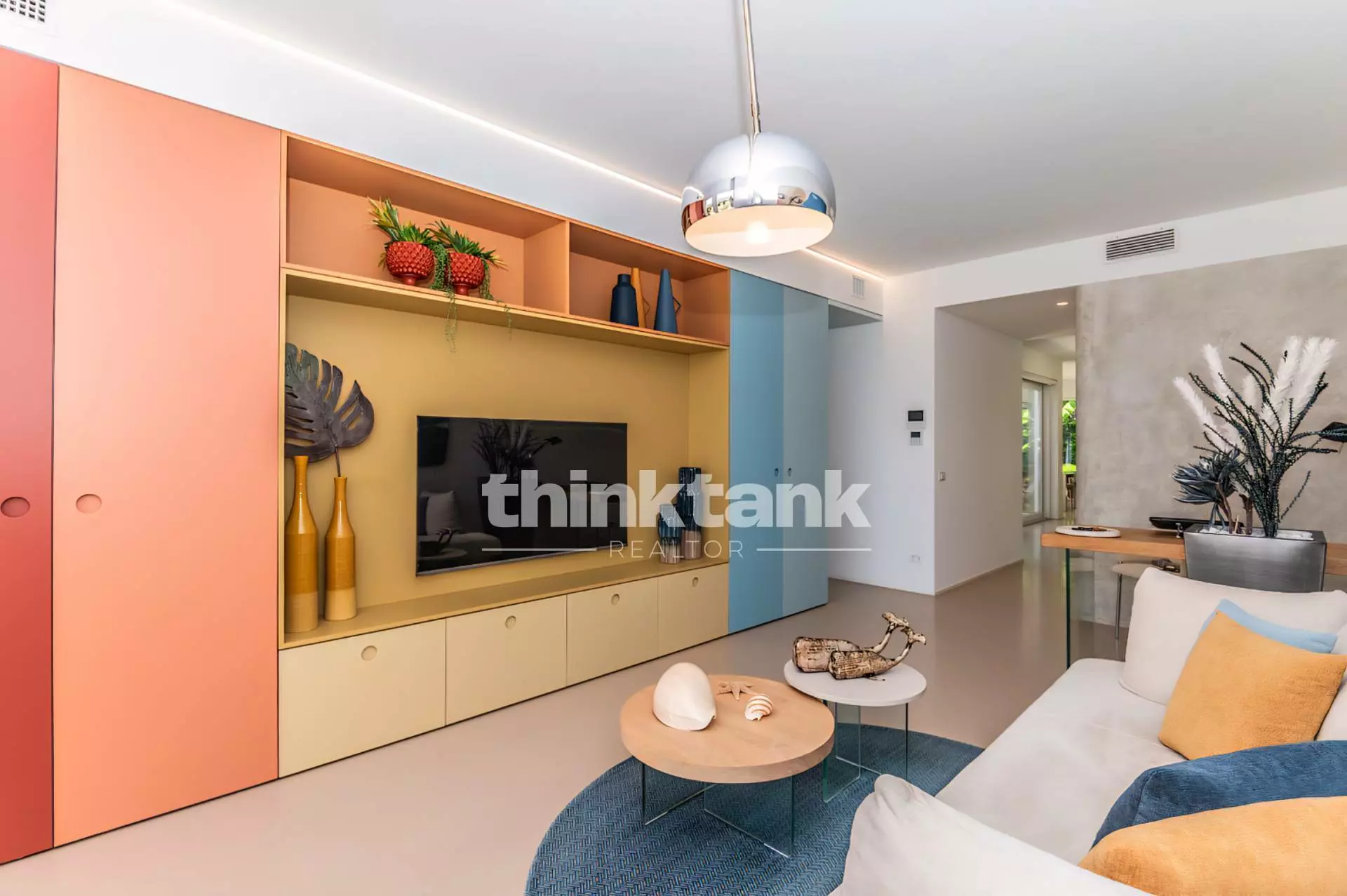At the entrance we find an elegant living room with a custom-made wall unit, which serves as a connecting element between the living area and the sleeping area.