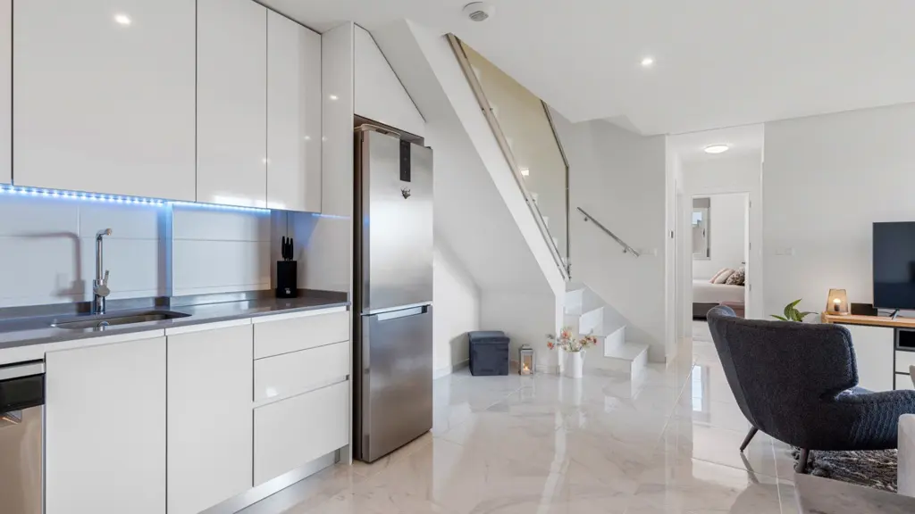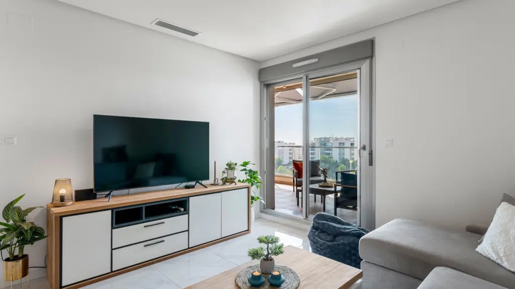 The apartment stands out with multiple modern features. Underfloor heating in the bathroom adds a level of comfort during cooler months. For climate control, the property is equipped with air conditioning that accommodates both cold and heat settings. Notably, the terrace is glazed with sun protection, making it usable in various weather conditions. There’s also space for a dining table that can comfortably seat 6 to 8 people.