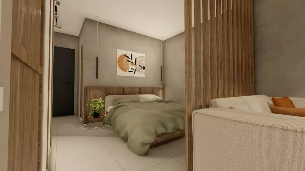 The apartment features a living room combined with a kitchen area, optimizing the use of space. There is also one shower WC included within the layout. This type of configuration is common in smaller properties, emphasizing functionality.