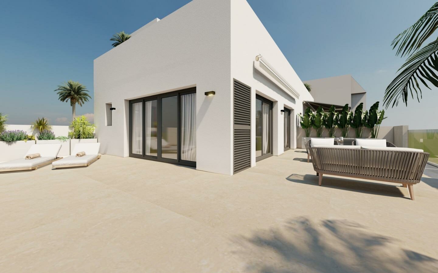 Each apartment features an open-plan American-style kitchen, a bright living-dining area, built-in wardrobes, and a private terrace. The building includes a lift designed for six people, and all residents have access to a communal rooftop solarium with showers and artificial grass, suitable for enjoying the sun and sea breeze.