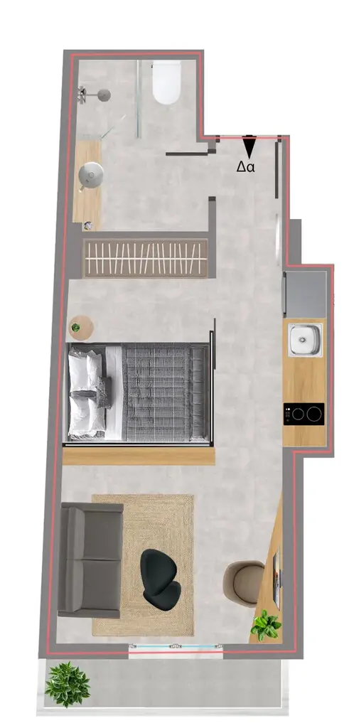 This apartment consists of one bedroom and a combined living room and kitchen area. The space is designed for functionality, making it a potential fit for individuals or couples. In addition, there is a shower WC, addressing necessary accommodations.
