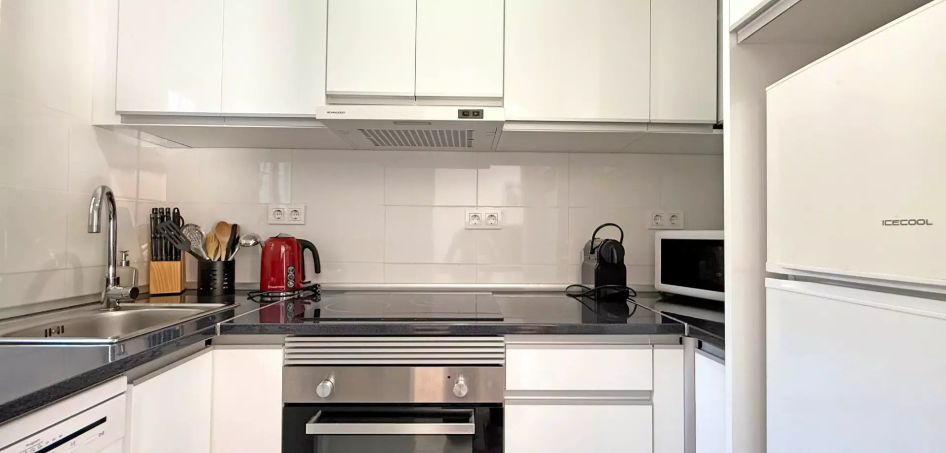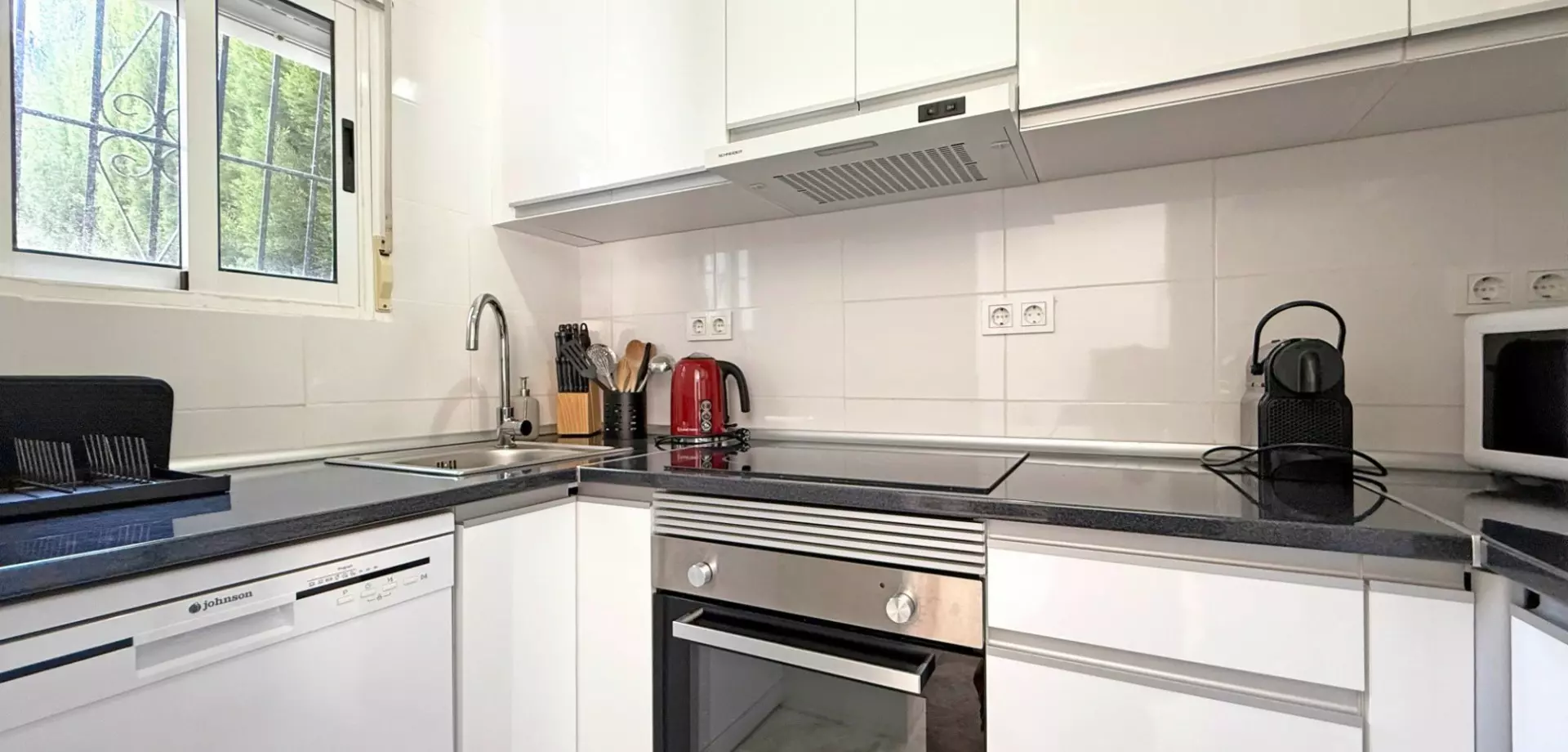 The large terrace is another standout feature, offering ample space for outdoor dining. This area is well-suited for enjoying the Mediterranean climate, making it a valuable addition to the apartment.