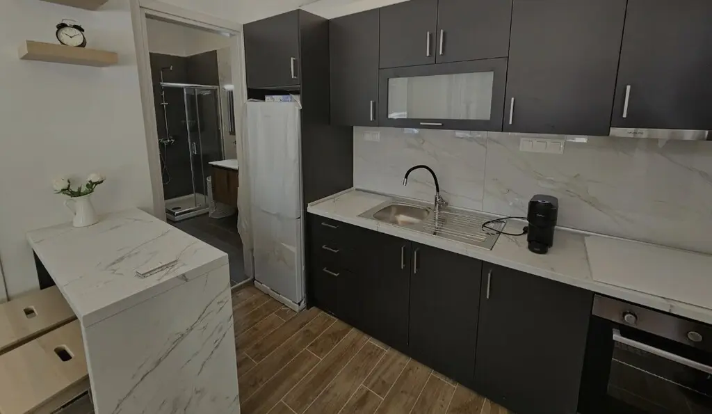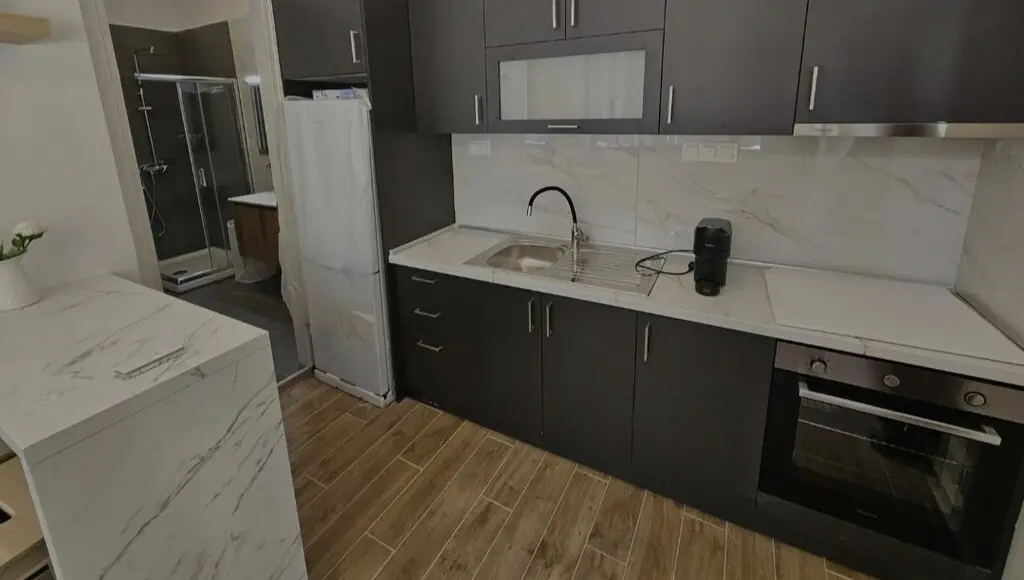 This apartment features one bedroom, a living room integrated with the kitchen, and a shower WC. The front layout allows ample light to enter, giving the space a bright atmosphere. From the windows, residents can enjoy a view of the city, making it a practical choice for those who want to stay connected to the urban lifestyle.