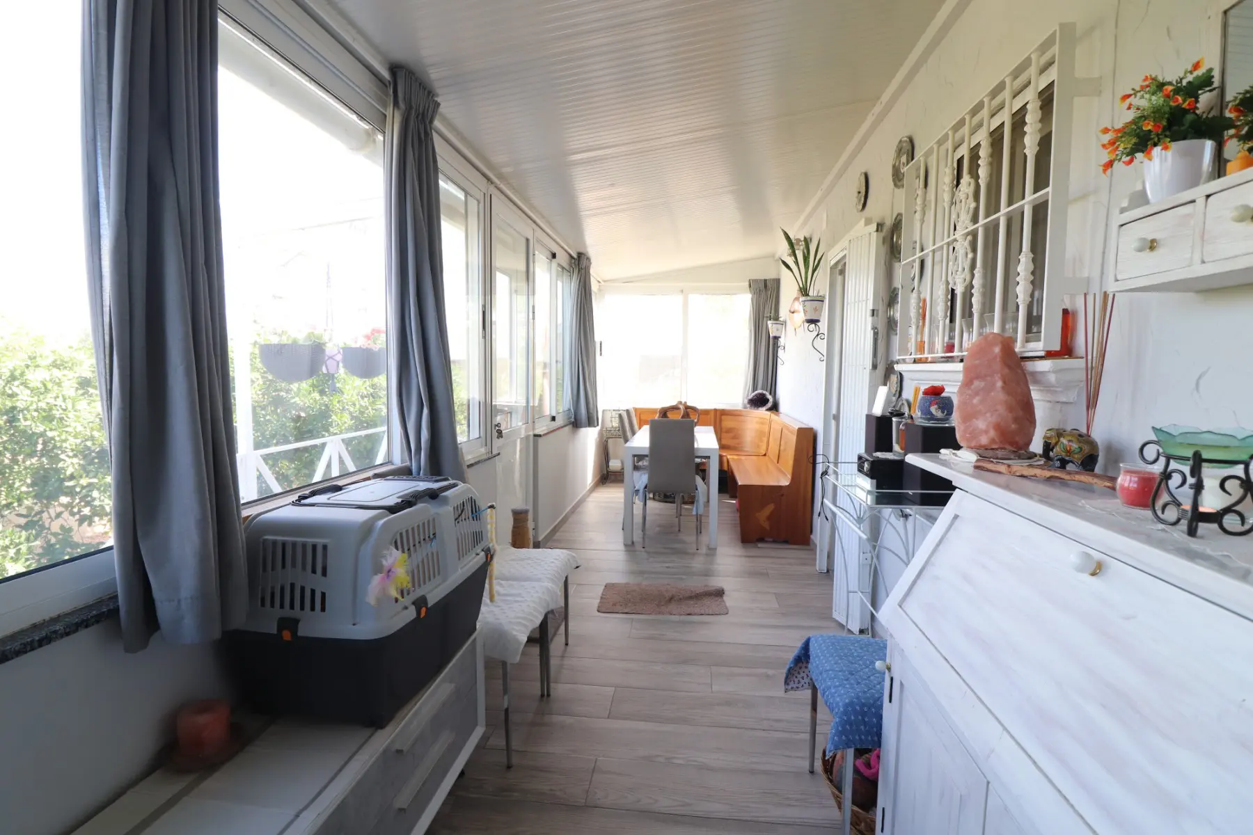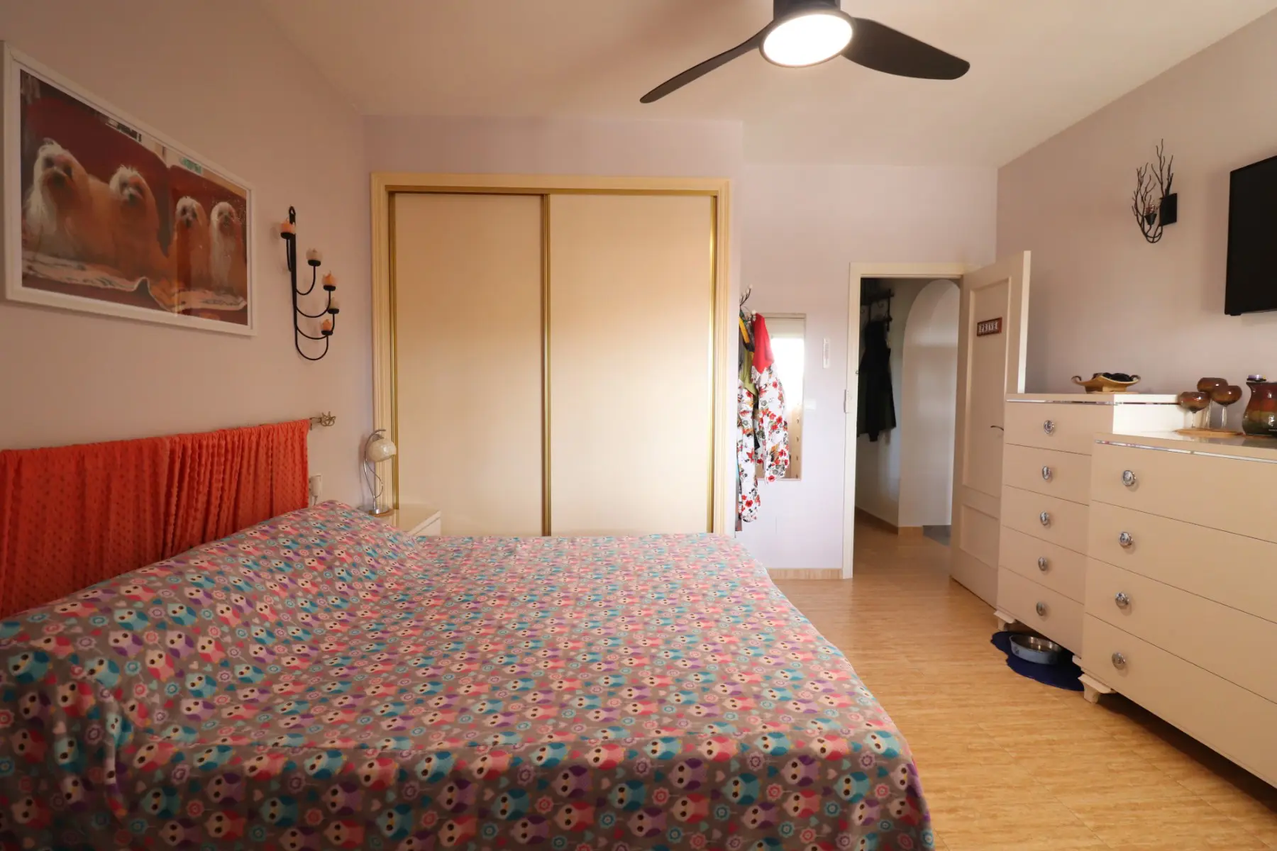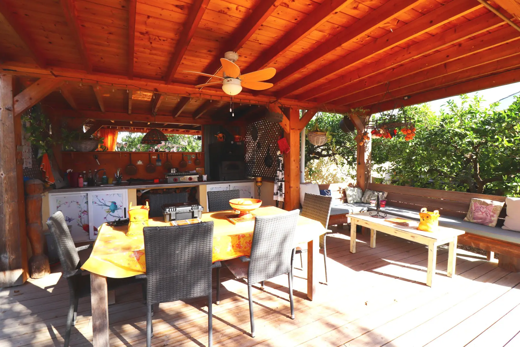 The villa spans 109 square meters, featuring an L-shaped covered terrace of 29 square meters that offers views of the private pool. Inside, you’ll find a living room equipped with air conditioning and a log burner fireplace. The kitchen comes separate and fitted, with a utility room accessible via a door. There are three double bedrooms, all with built-in wardrobes. The master bedroom includes an en suite shower and wet room plus a ceiling fan. A notable feature of the second bedroom is its direct access through double glazed sliding doors to the terrace and garden. Additionally, there is a family shower room available.